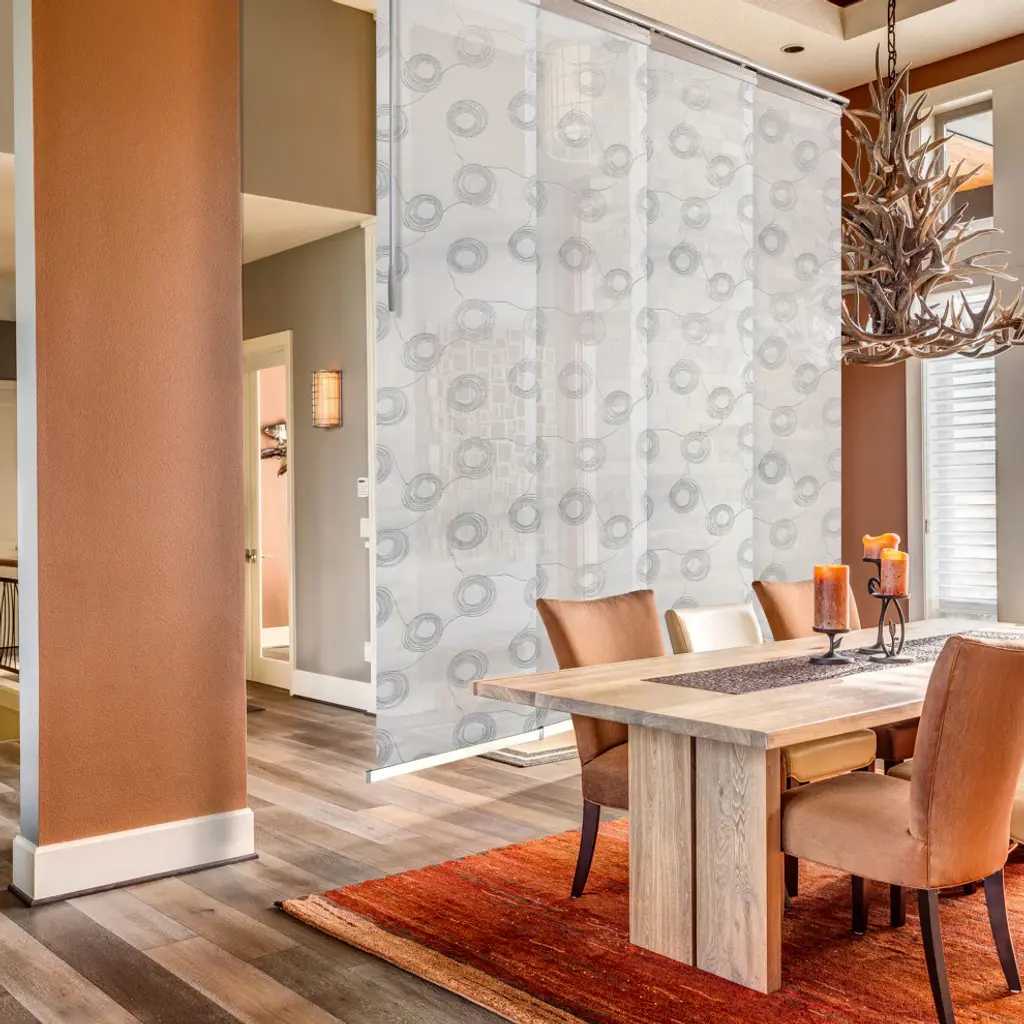 Central Design Products is pleased to introduce a new innovative panel track that offers easy 2-way installation, adding an alluring style and refined touch to your home decor. The single rail design of the track is sleek, compact, and reduces the overall footprint and weight of the installation, eliminating bulky, intrusive window treatments. Adjusting the panel height is a breeze � simply trim the panel, re-attach the liner, and install the panel weight. Detailed instructions are included.The panel track also features a patented slider design, made with aluminum and fitted with bearings that allow for durable and smooth operation. The sliders are stacked closer together than conventional panel tracks, reducing light bleed coming from the gaps between panels. This track has endless uses from dividing rooms, garages, offices, and closets to decorating windows and patios. Available in larger sizes including 8, 10, and 12 panels. Extends from 48-88� wide. Each panel measures 23.5" wide and 116" tall, with a total installation height of 118.5" (includes the 2.5" rail track). The track can be wall or ceiling mounted. The panels can stack on the left or the right. The clearance from the wall is extendable from 1.25� to 3.25� and projection from the wall is extendable from 3� to 4.25�. Salma panel is made from 100% Polyester, with a light filtering shade that blocks 50% of the light.