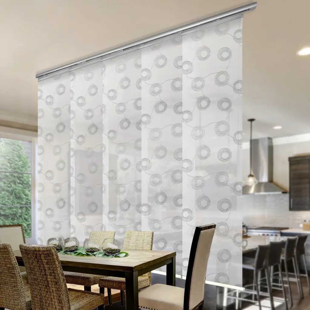 Central Design Products is pleased to introduce a new innovative panel track that offers easy 2-way installation, adding an alluring style and refined touch to your home decor. The single rail design of the track is sleek, compact, and reduces the overall footprint and weight of the installation, eliminating bulky, intrusive window treatments. Adjusting the panel height is a breeze � simply trim the panel, re-attach the liner, and install the panel weight. Detailed instructions are included.The panel track also features a patented slider design, made with aluminum and fitted with bearings that allow for durable and smooth operation. The sliders are stacked closer together than conventional panel tracks, reducing light bleed coming from the gaps between panels. This track has endless uses from dividing rooms, garages, offices, and closets to decorating windows and patios. Available in larger sizes including 8, 10, and 12 panels. Extends from 58-110� wide. Each panel measures 23.5" wide and 91.5" tall, with a total installation height of 94" (includes the 2.5" rail track). The track can be wall or ceiling mounted. The panels can stack on the left or the right. The clearance from the wall is extendable from 1.25� to 3.25� and projection from the wall is extendable from 3� to 4.25�. Salma panel is made from 100% Polyester, with a light filtering shade that blocks 50% of the light.
