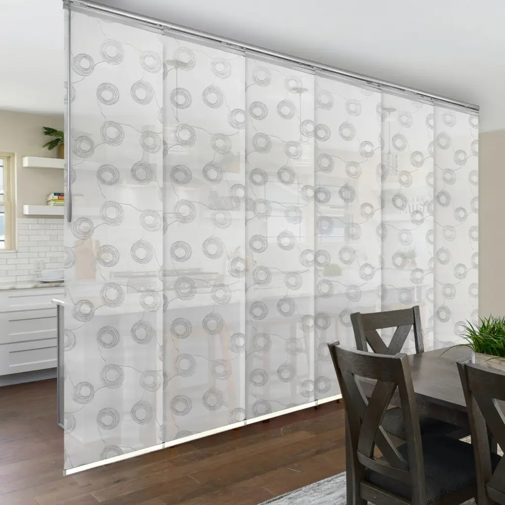 Central Design Products is pleased to introduce a new innovative panel track that offers easy 2-way installation, adding an alluring style and refined touch to your home decor. The single rail design of the track is sleek, compact, and reduces the overall footprint and weight of the installation, eliminating bulky, intrusive window treatments. Adjusting the panel height is a breeze � simply trim the panel, re-attach the liner, and install the panel weight. Detailed instructions are included.The panel track also features a patented slider design, made with aluminum and fitted with bearings that allow for durable and smooth operation. The sliders are stacked closer together than conventional panel tracks, reducing light bleed coming from the gaps between panels. This track has endless uses from dividing rooms, garages, offices, and closets to decorating windows and patios. Available in larger sizes including 8, 10, and 12 panels. Extends from 98-130� wide. Each panel measures 23.5" wide and 116" tall, with a total installation height of 118.5" (includes the 2.5" rail track). The track can be wall or ceiling mounted. The panels can stack on the left or the right. The clearance from the wall is extendable from 1.25� to 3.25� and projection from the wall is extendable from 3� to 4.25�. Salma panel is made from 100% Polyester, with a light filtering shade that blocks 50% of the light.