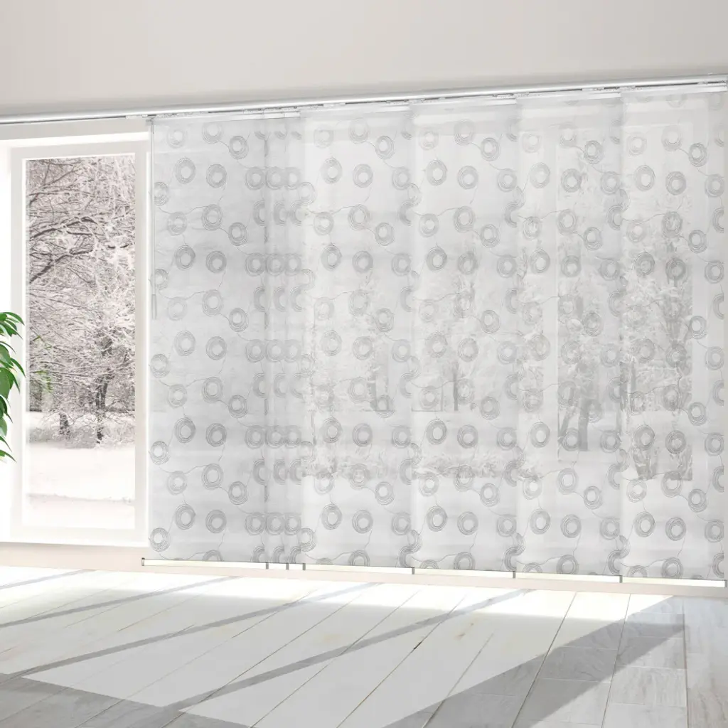 Central Design Products is pleased to introduce a new innovative panel track that offers easy 2-way installation, adding an alluring style and refined touch to your home decor. The single rail design of the track is sleek, compact, and reduces the overall footprint and weight of the installation, eliminating bulky, intrusive window treatments. Adjusting the panel height is a breeze � simply trim the panel, re-attach the liner, and install the panel weight. Detailed instructions are included.The panel track also features a patented slider design, made with aluminum and fitted with bearings that allow for durable and smooth operation. The sliders are stacked closer together than conventional panel tracks, reducing light bleed coming from the gaps between panels. This track has endless uses from dividing rooms, garages, offices, and closets to decorating windows and patios. Available in larger sizes including 8, 10, and 12 panels. Extends from 110-153� wide. Each panel measures 23.5" wide and 91.5" tall, with a total installation height of 94" (includes the 2.5" rail track). The track can be wall or ceiling mounted. The panels can stack on the left or the right. The clearance from the wall is extendable from 1.25� to 3.25� and projection from the wall is extendable from 3� to 4.25�. Salma panel is made from 100% Polyester, with a light filtering shade that blocks 50% of the light.