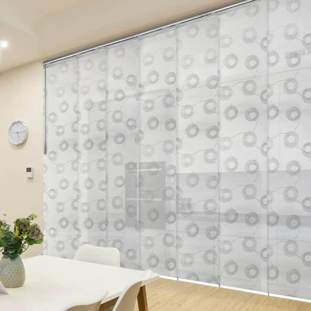 Central Design Products is pleased to introduce a new innovative panel track that offers easy 2-way installation, adding an alluring style and refined touch to your home decor. The single rail design of the track is sleek, compact, and reduces the overall footprint and weight of the installation, eliminating bulky, intrusive window treatments. Adjusting the panel height is a breeze � simply trim the panel, re-attach the liner, and install the panel weight. Detailed instructions are included.The panel track also features a patented slider design, made with aluminum and fitted with bearings that allow for durable and smooth operation. The sliders are stacked closer together than conventional panel tracks, reducing light bleed coming from the gaps between panels. This track has endless uses from dividing rooms, garages, offices, and closets to decorating windows and patios. Available in larger sizes including 8, 10, and 12 panels. Extends from 110-153� wide. Each panel measures 23.5" wide and 116" tall, with a total installation height of 118.5" (includes the 2.5" rail track). The track can be wall or ceiling mounted. The panels can stack on the left or the right. The clearance from the wall is extendable from 1.25� to 3.25� and projection from the wall is extendable from 3� to 4.25�. Salma panel is made from 100% Polyester, with a light filtering shade that blocks 50% of the light.