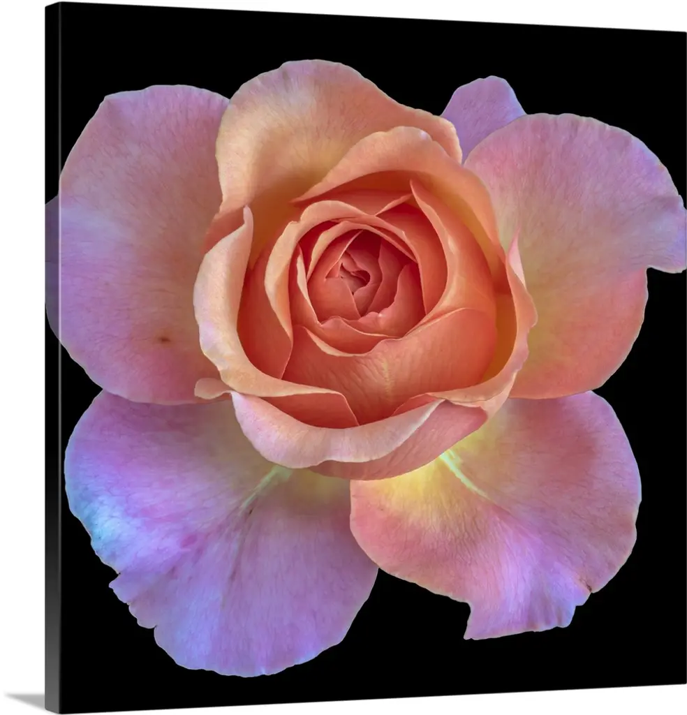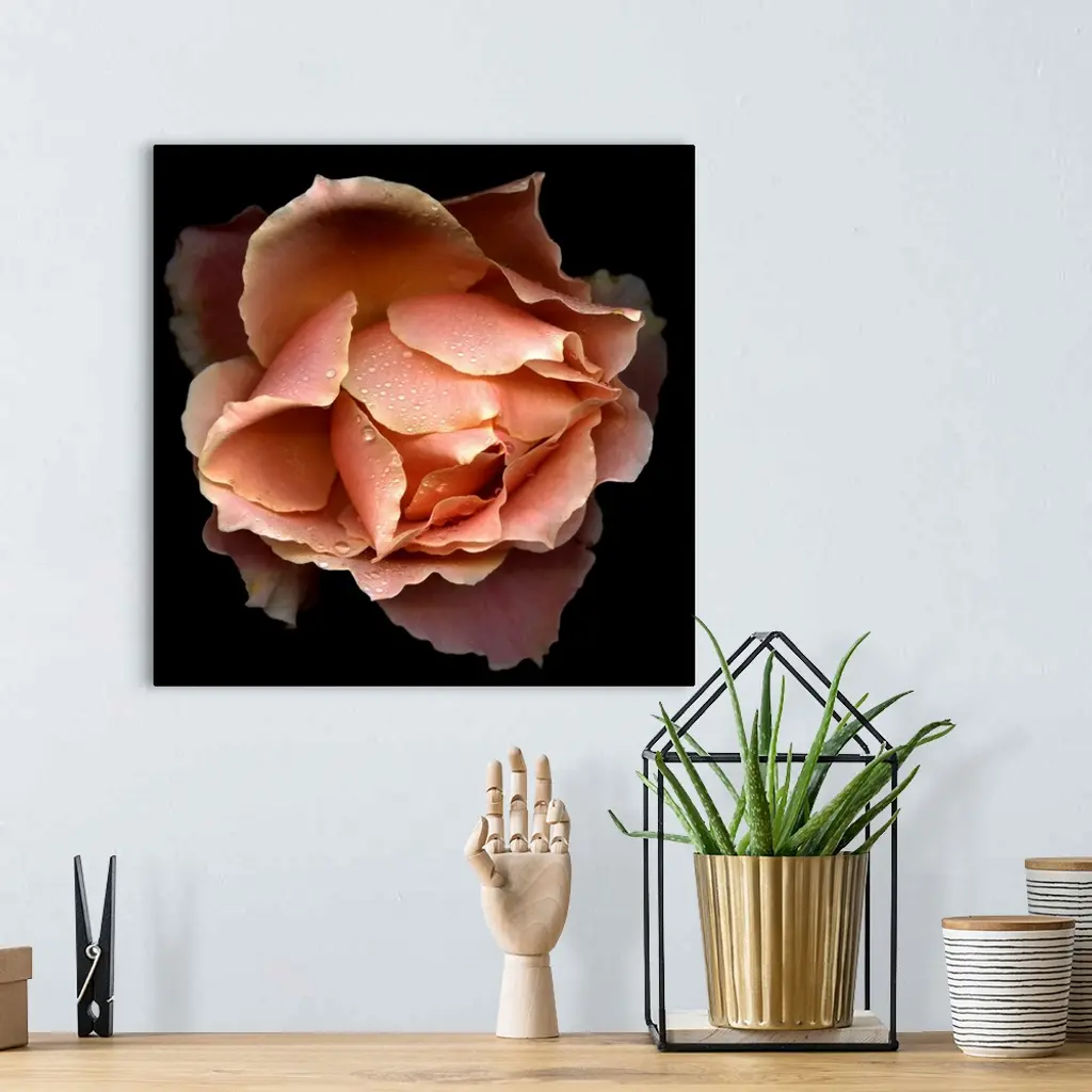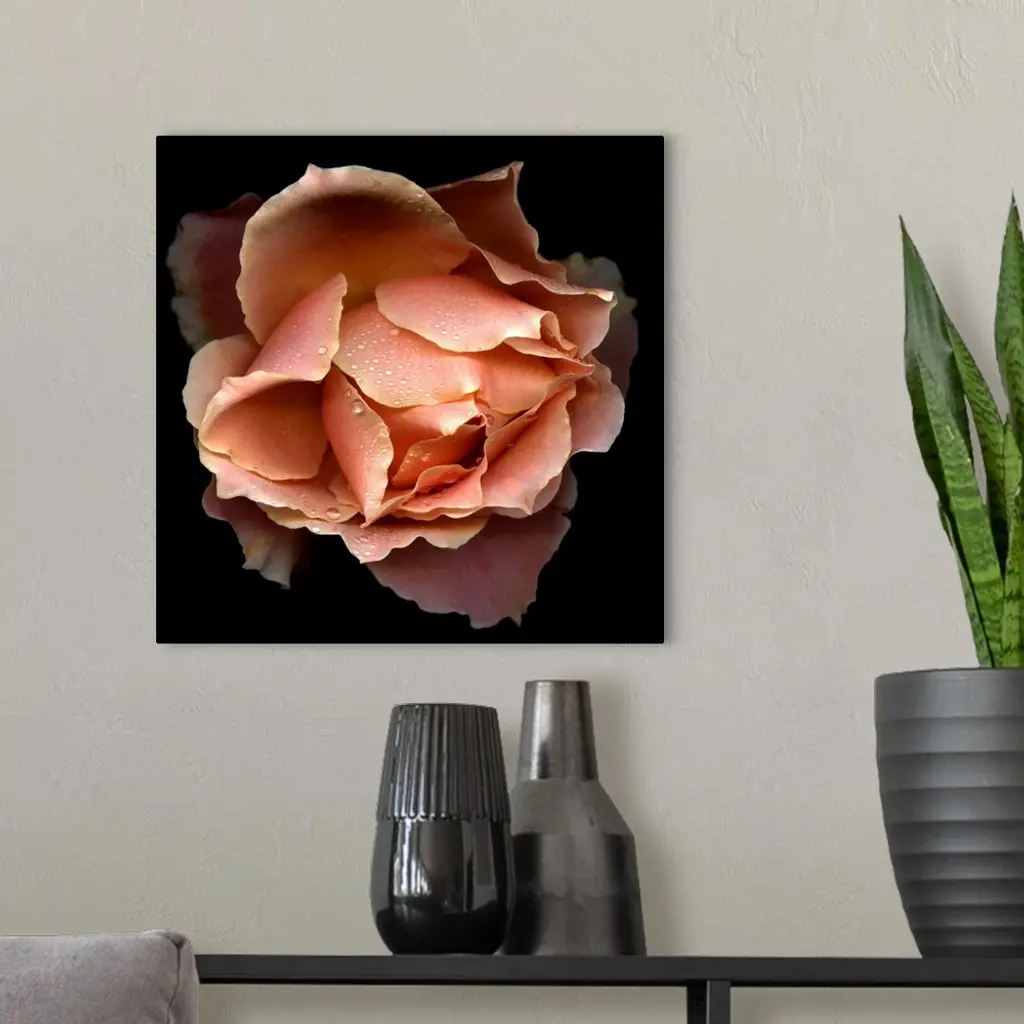 Salmon coloured rose from the top showing petals opening. This rose type is called, Just Joey.