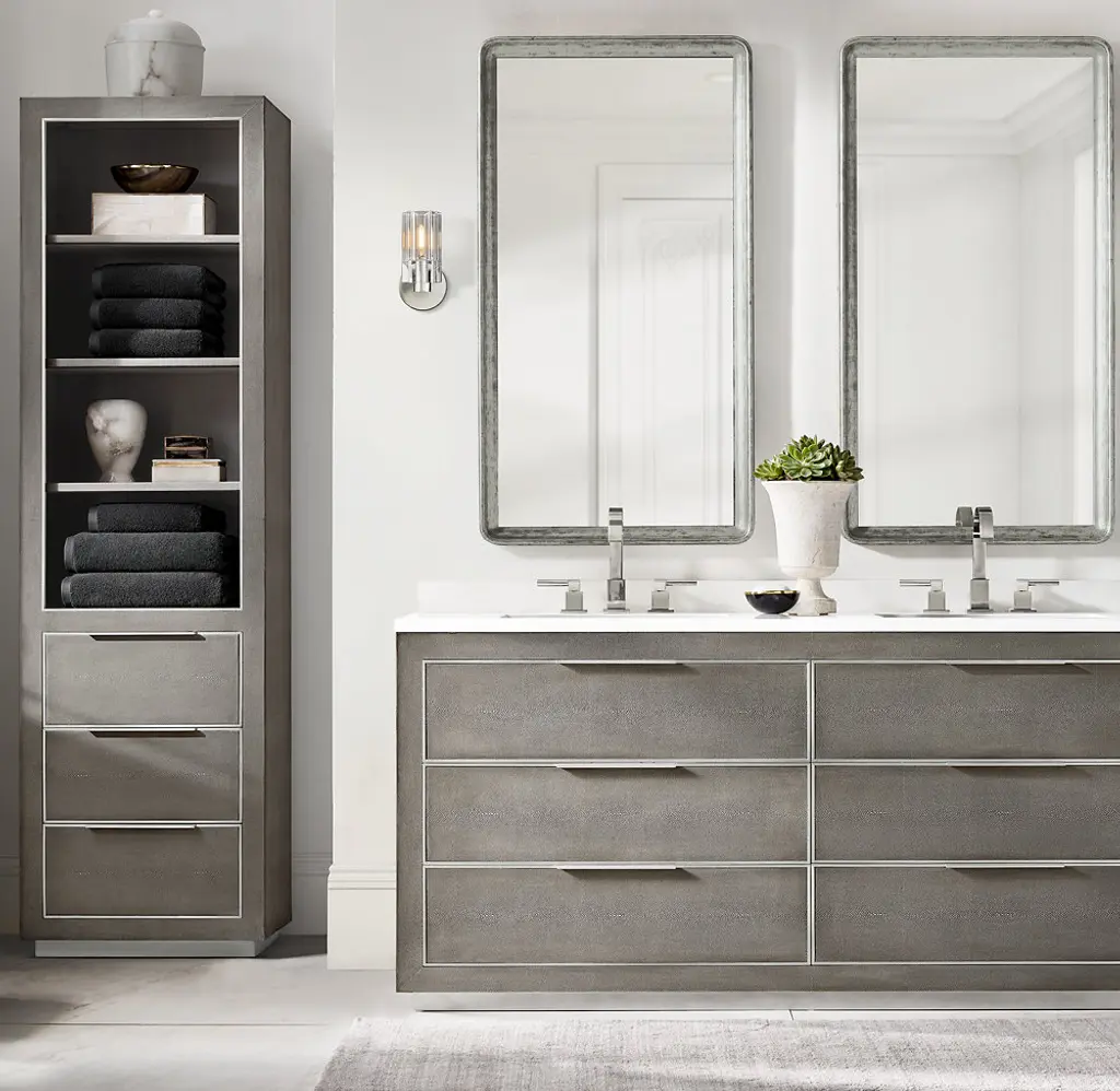 Inspired by salon mirrors of the French Second Empire period, circa 1865, ours has a slender frame with refined corners – rounded on the outside, squared on the inside – that lend it an understated elegance. A hand-rubbed metal-leaf finish is applied over black paint, resulting in a modulated tonality.