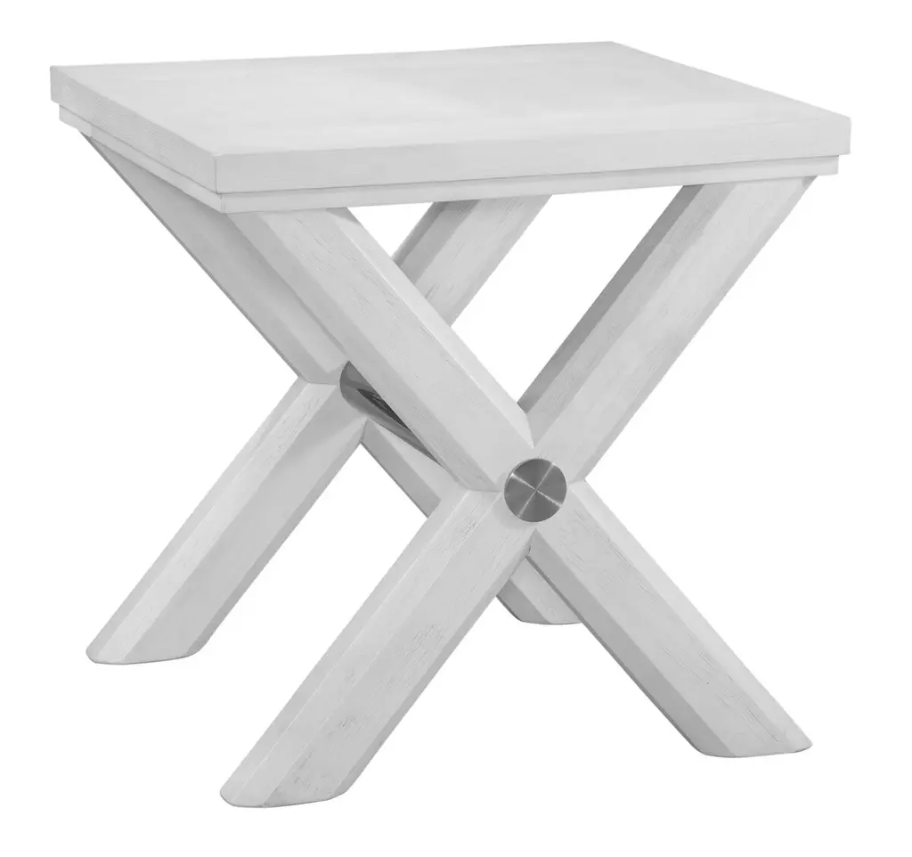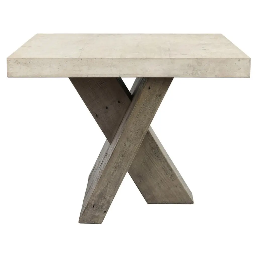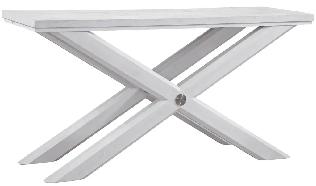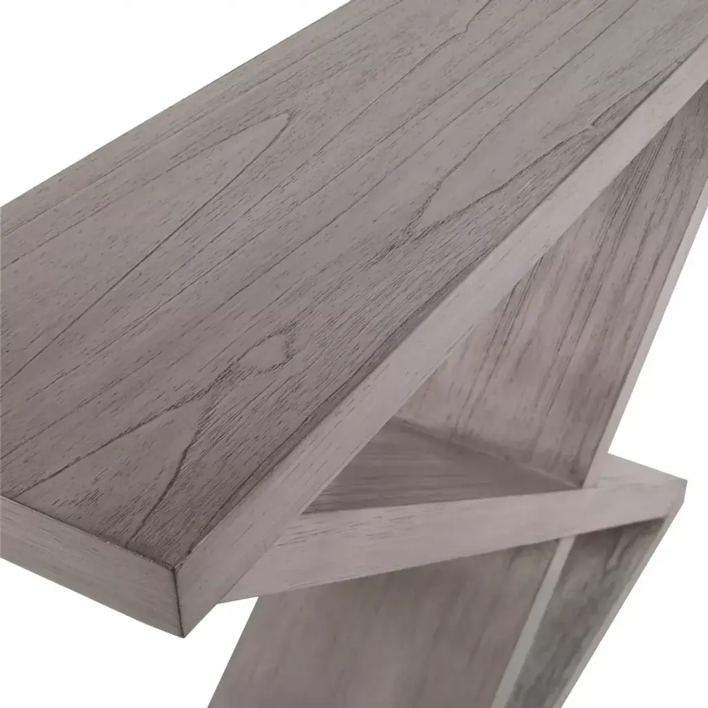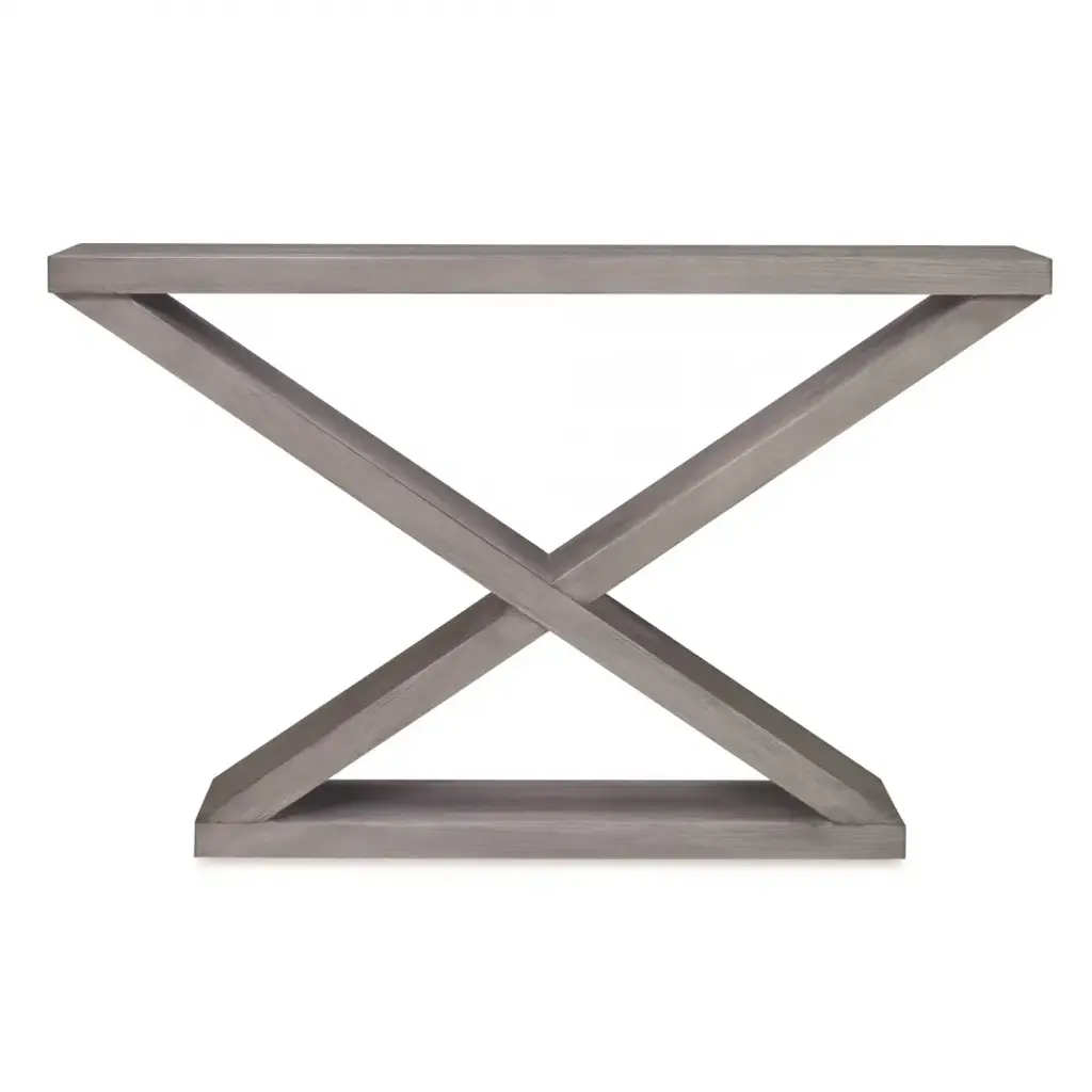 Clean-lined console crafted from solid mindi in light distressed grey finish.