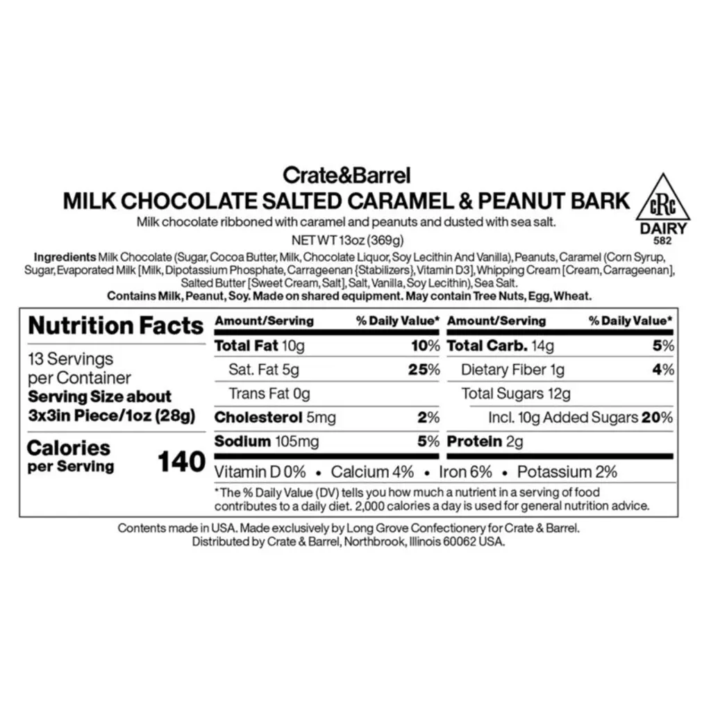 An indulgent mix of creamy milk chocolate, buttery caramel and crunchy seasoned peanuts is sprinkled with sea salt for an irresistible treat. The gift-ready tin is ideal for hosts, hostesses and unexpected guests. Our salted chocolate caramel peanut bark is a Crate & Barrel exclusive.The Long Grove Confectionery first began making our delicious chocolates and confections in 1977 in a small kitchen in their family-owned candy shop in a little red schoolhouse. More than 35 years later, we're still sweet on their highest-quality ingredientspure chocolate, dairy-fresh whipping cream, whole butter, creamy caramel and more.