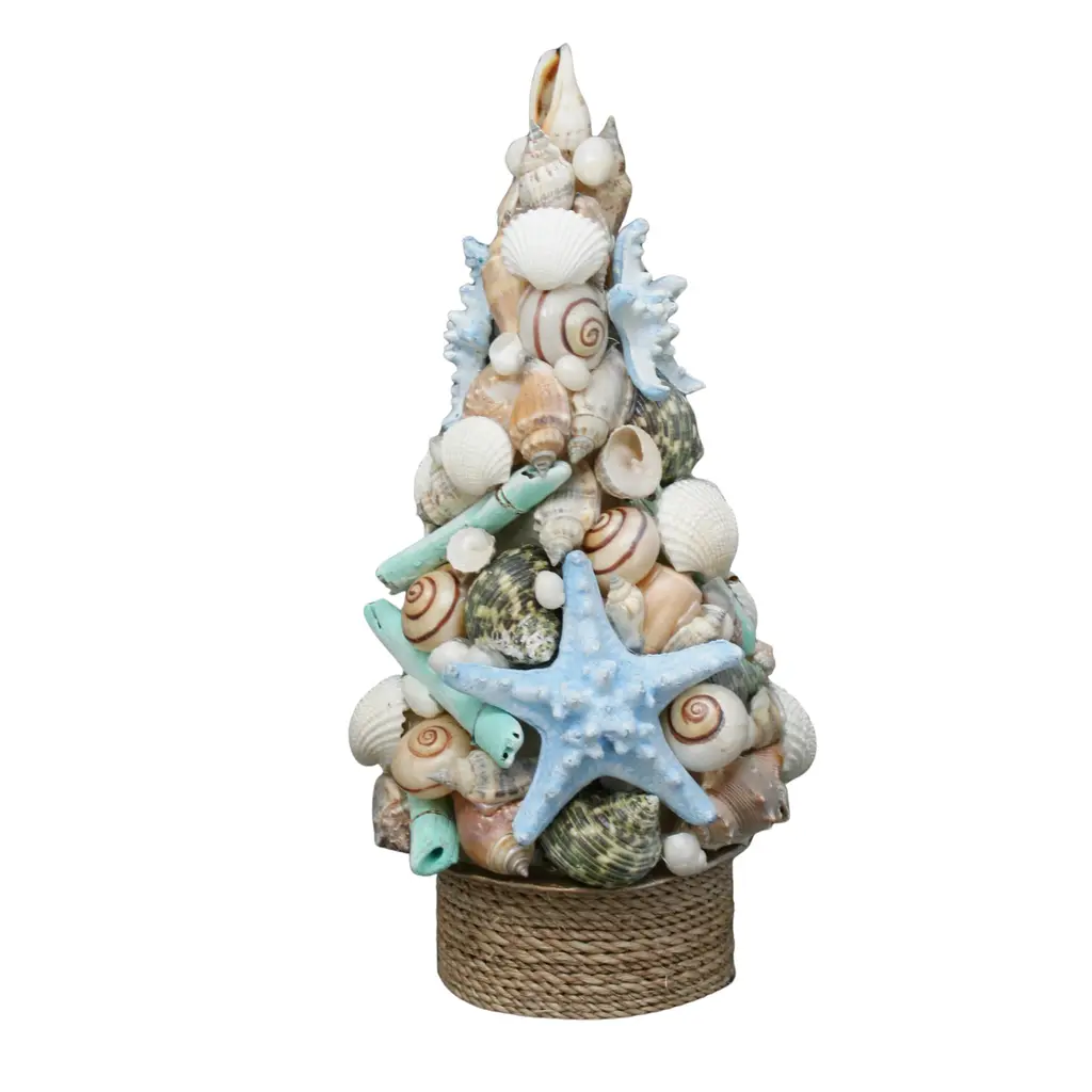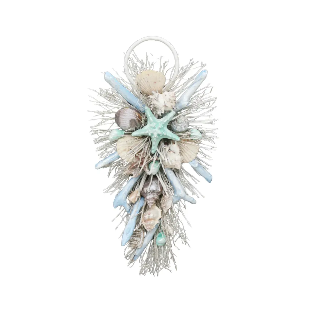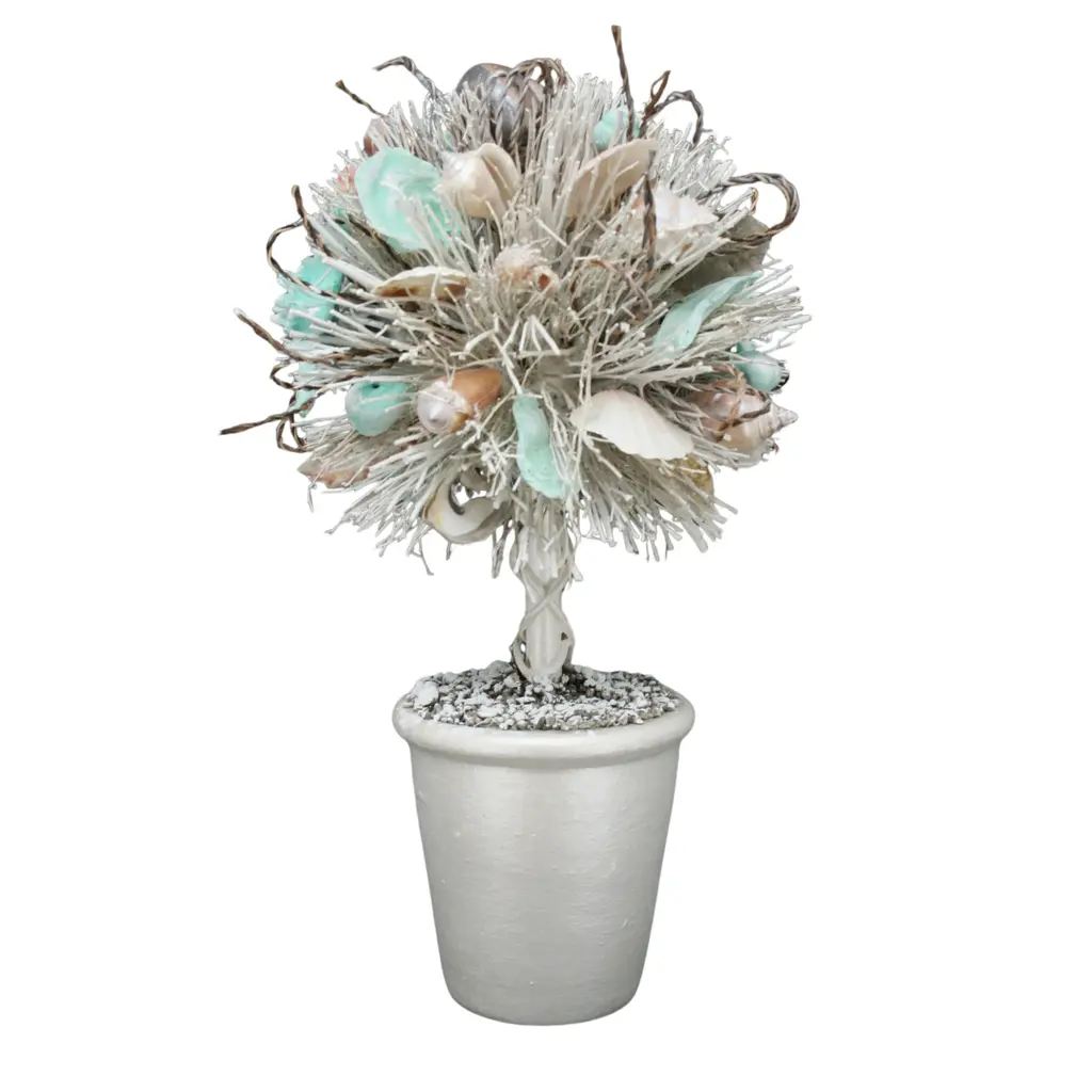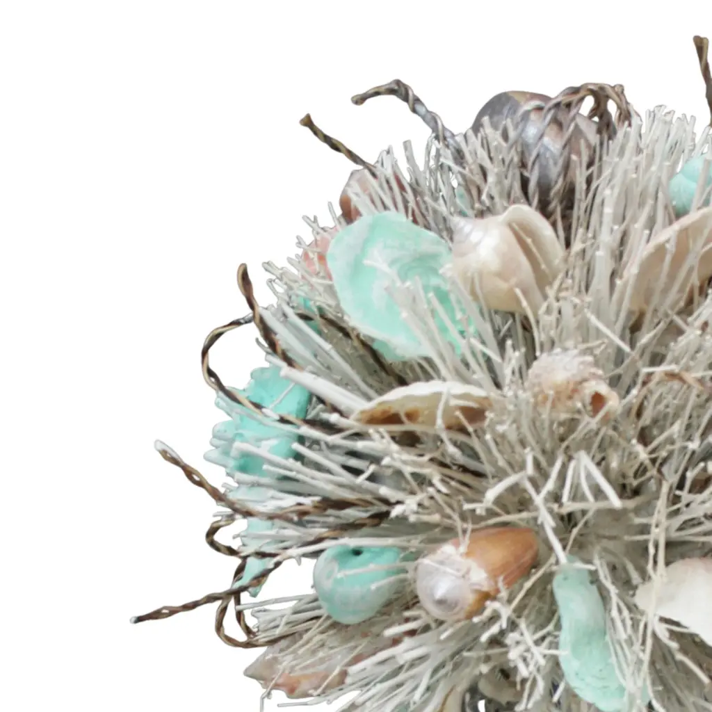 Bring the calm of the coast into your home with this handcrafted topiary, a sculptural blend of ocean elements and organic texture. Real shells - each selected for their soft ivory and natural beauty - are nestled among shades of blue, from misty aqua to coastal sky, evoking the layered hues of sea and air. Coco twigs provide earthy contrast, enhancing the natural depth and texture of the piece.