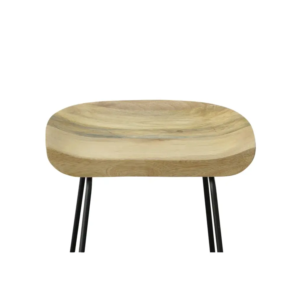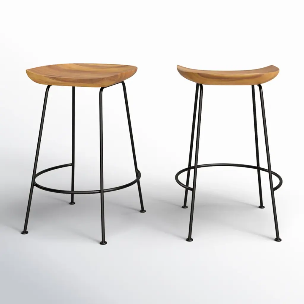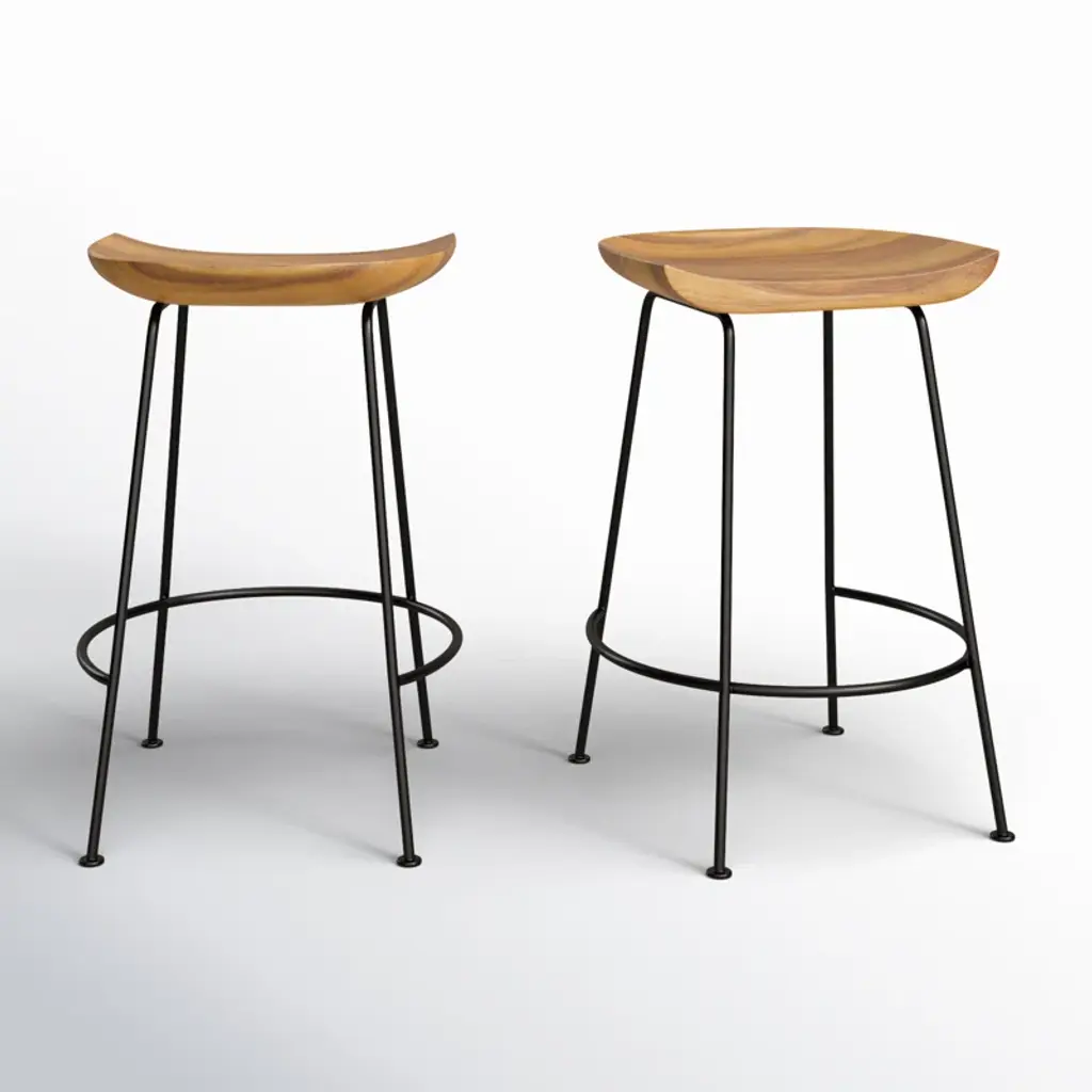 Fusing solid mango wood and rustic iron, this set of 2 stools is perfect for pairing with a variety of aesthetics. Powder-coated metal frame, the tiny, slightly tapered legs showcase an open semicircle footrest for added support and comfort. Up top, the scooped solid wood seat adds a rustic, regal look that beautifully contrasts the rest of the frame. Why we love it: The wood seats feature natural wood grain color variation, so no item has the same finish, grain color, or wood knots.