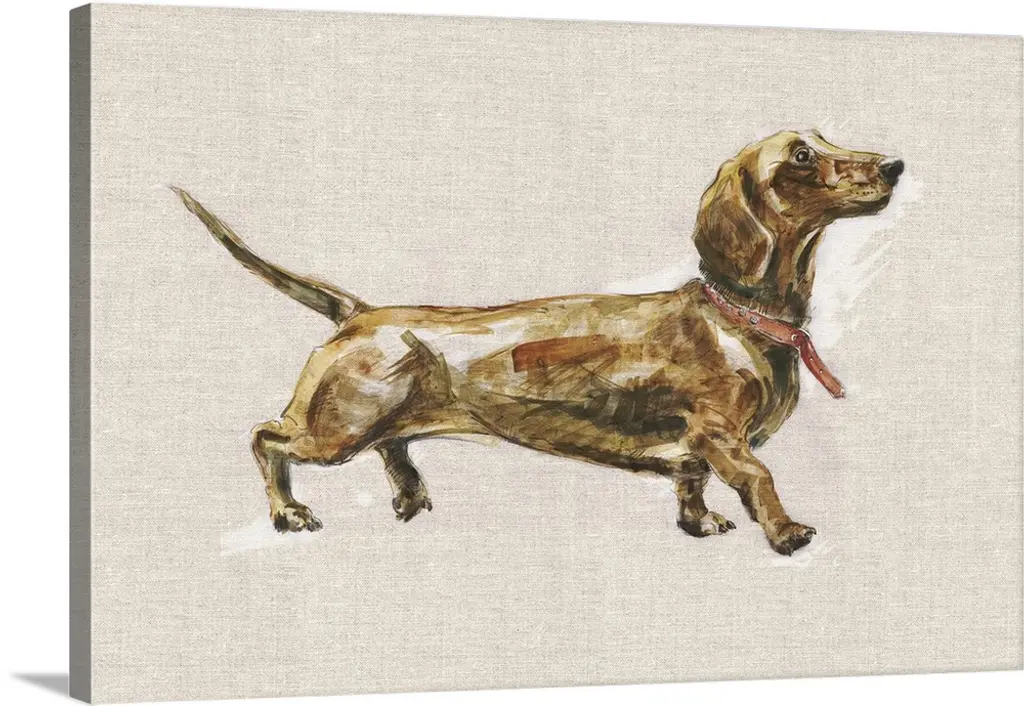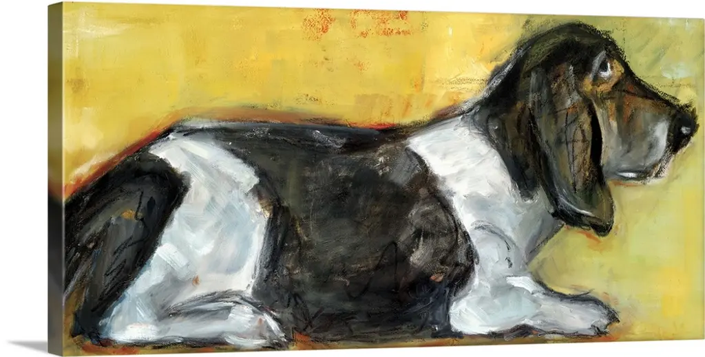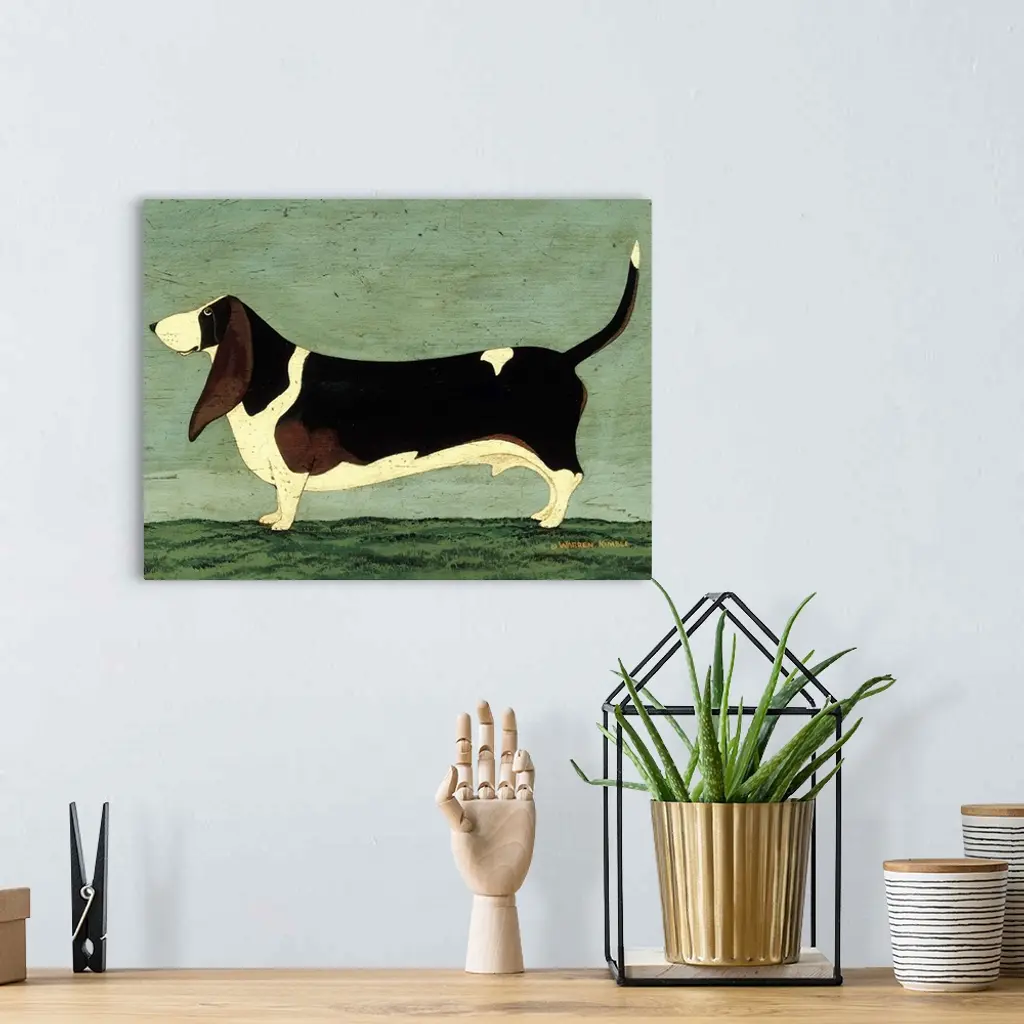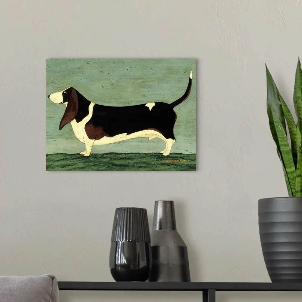 This whimsical drawing is of a beagle dog standing on a patch of grass with the sky behind it that appears to be scratched.