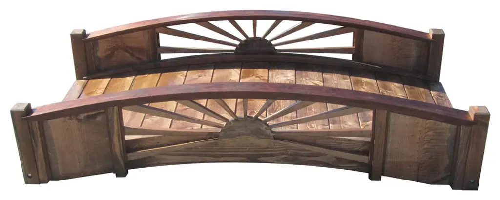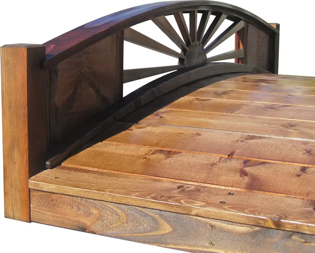 Brighten your walkway or pond with this unique Sunburst Bridge. Our gracefully arched wood garden bridges blend into any landscape theme, highlight your water features and rock gardens, adding a spirit-nurturing aspect to your garden. It spans up to 54". Made of North American Douglas Fir, Spruce, Pine, and clear Pine, with durable construction of custom quality, and easy assembly. Handcrafted in the USA, superb craftsmanship, labor of love.Gracefully arched wood garden bridges to highlight your rock garden or pond.Our interlocking construction for aesthetic sleek designs with fewer screws and long-lasting products.Supported by two full length floor joists, mildly arched flooring is durable and easy to walk on.Treated with an oil based semi-transparent brown wood preservative, ready to finish to your liking; the color will turn lighter over time.It spans up to 54" (137 cm between the arch) and assembles with ease.