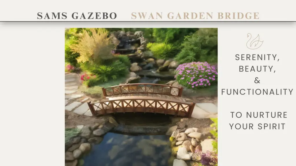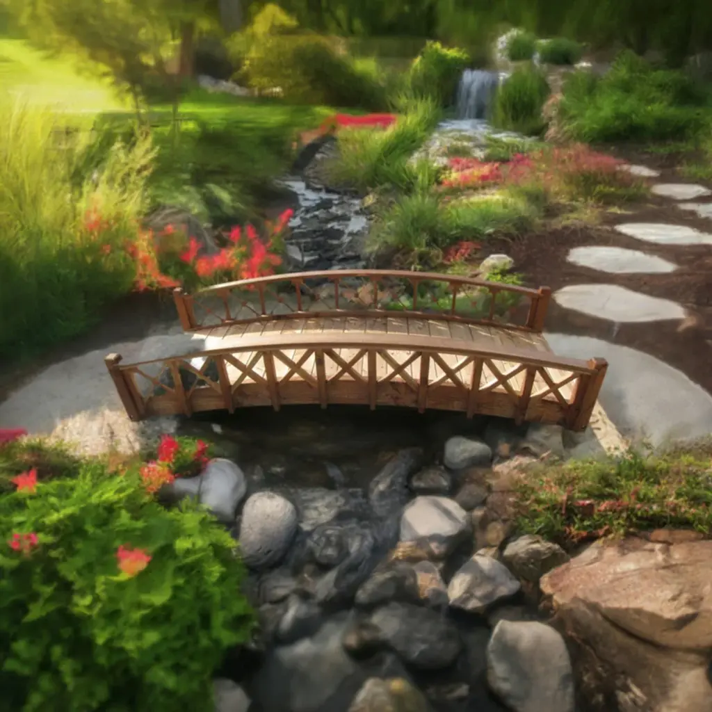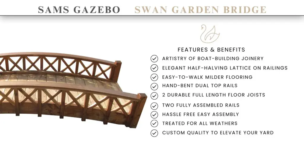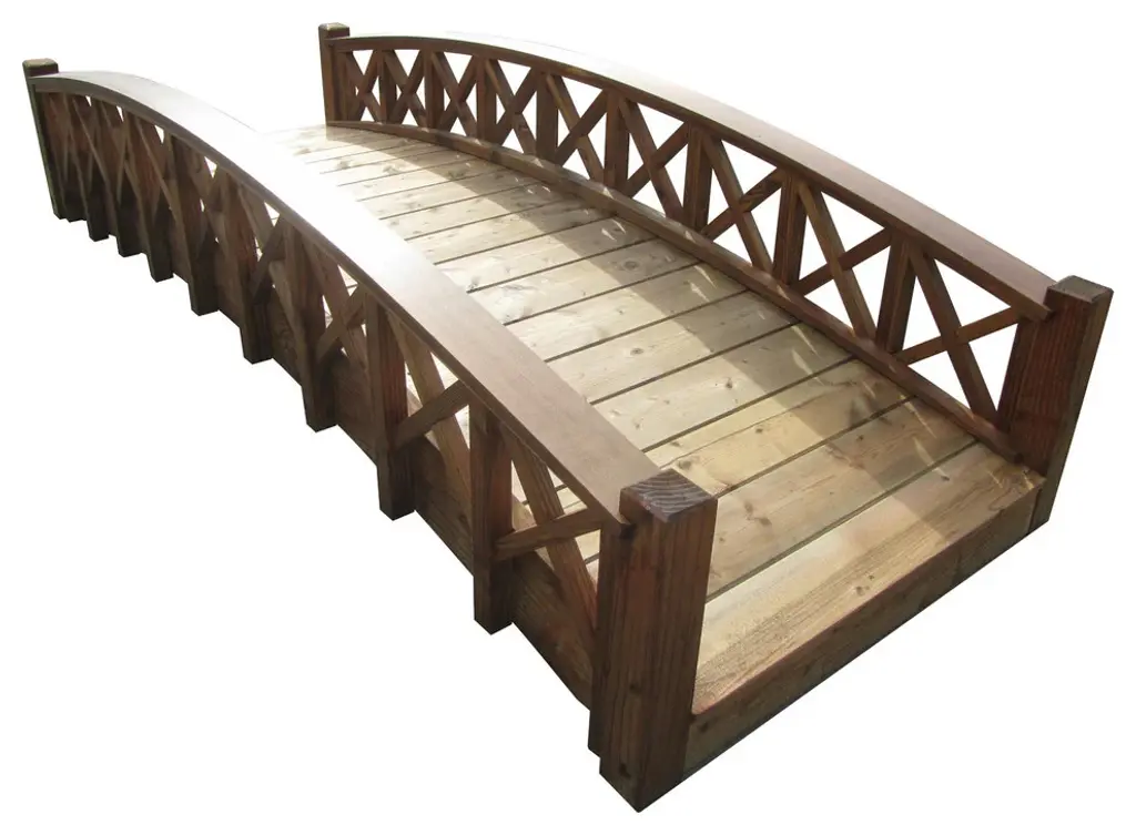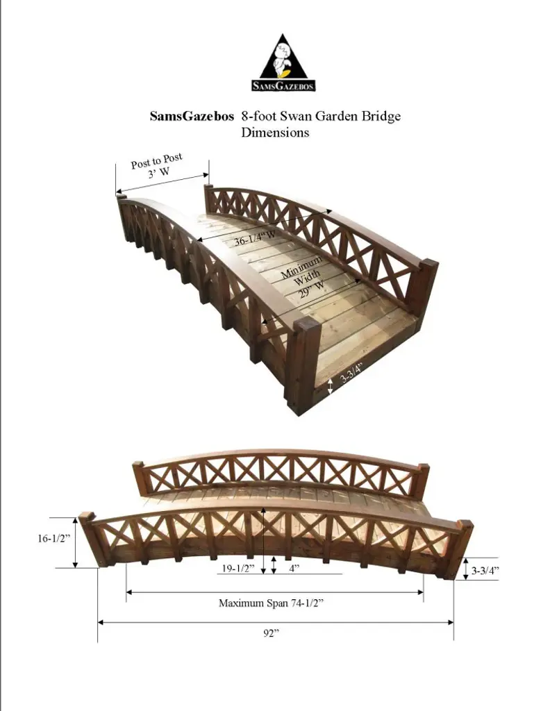 Our gracefully arched wood garden bridges blend into any landscape theme, highlight your water features and rock gardens, adding a spirit-nurturing aspect to your garden. It spans up to 81". Made of North American Douglas Fir, Spruce, and Pine, with durable construction of custom quality, and easy to assemble. Made in the USA, superb craftsmanship, and labor of love.Gracefully arched wood garden bridges with cross halved lattice railings to highlight your rock gardOur interlocking construction for aesthetic sleek designs with fewer screws and long-lasting productSupported by two full length floor joists, mildly arched 1 x 6 tongue and groove flooring is durable and easy to walk on.Treated with an oil based semi-transparent brown wood preservative, ready to finish to your liking; the color will turn lighter over time.It spans up to 81" and assembles with ease.