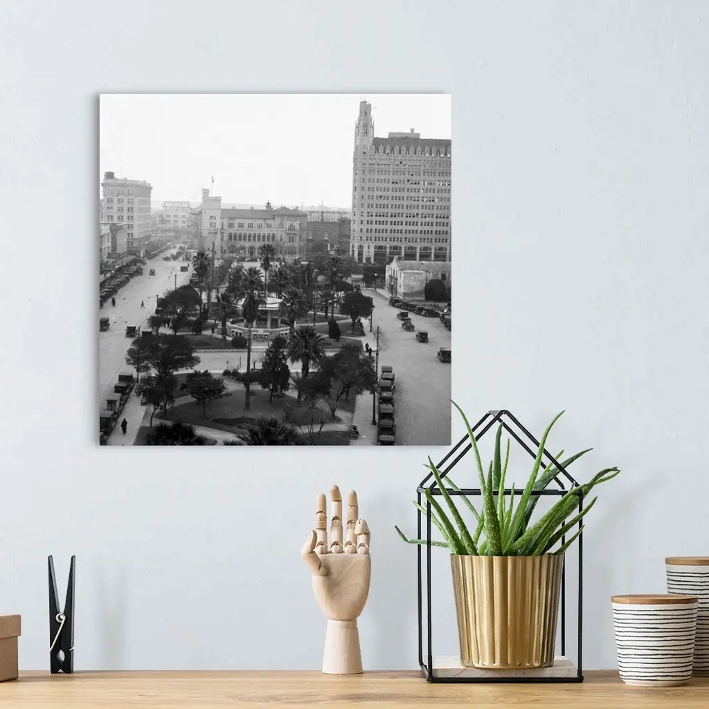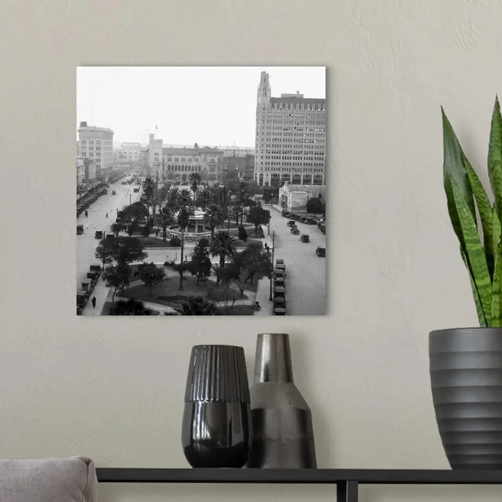 The Alamo Plaza at San Antonio, Texas, with the Alamo Mission at right. Stereograph view, c1920.
