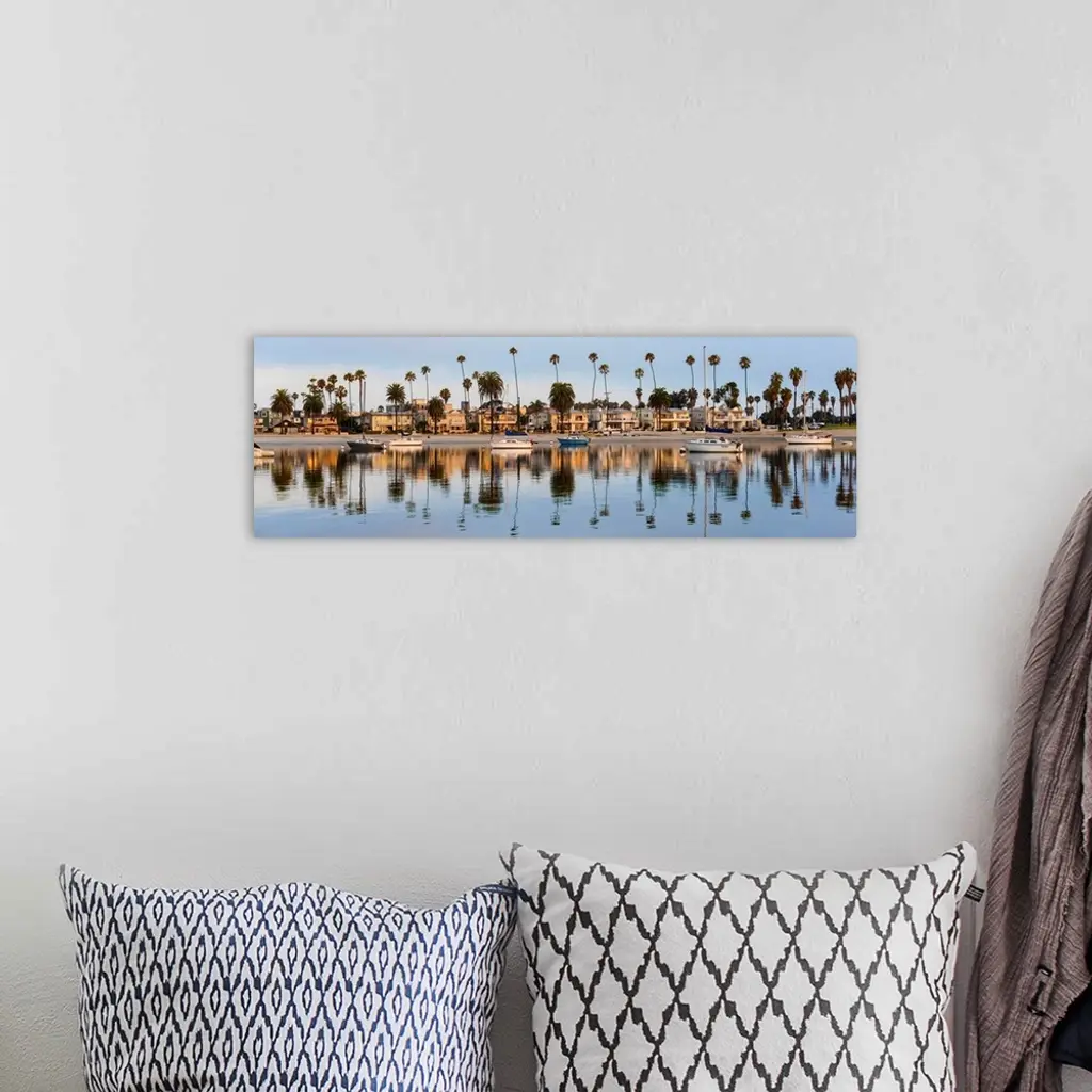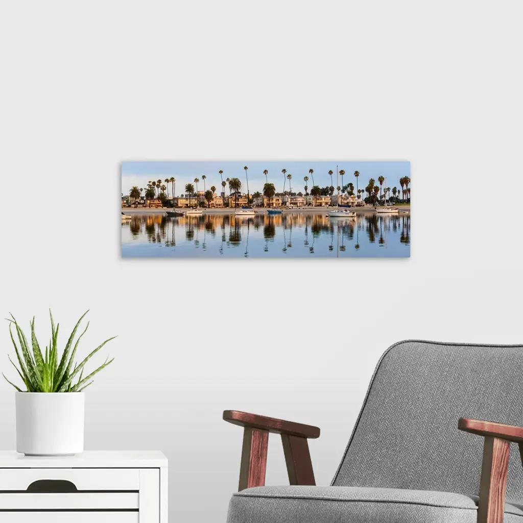 Panoramic photograph of beach houses, palm trees, and boats on the San Diego coast reflecting into the water.