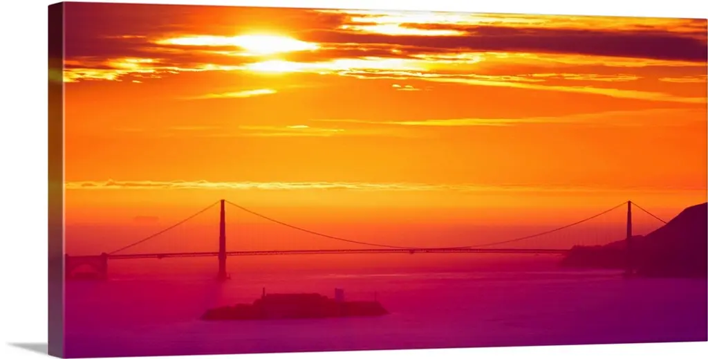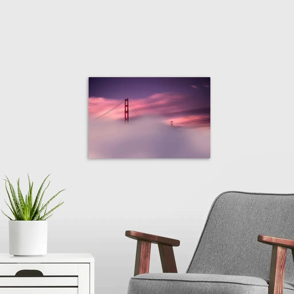 A sunset obscured by dense fog and the Golden Gate Bridge rising out of the mist in this landscape photograph.