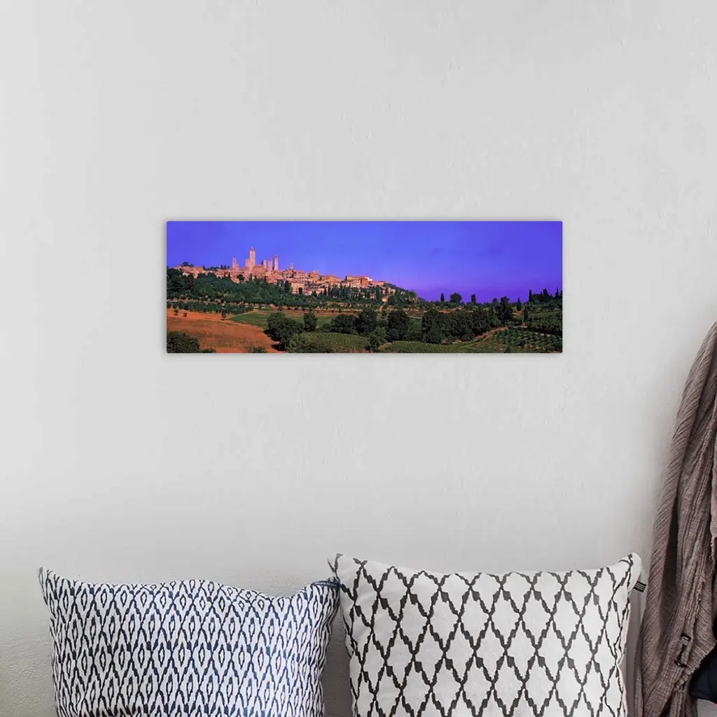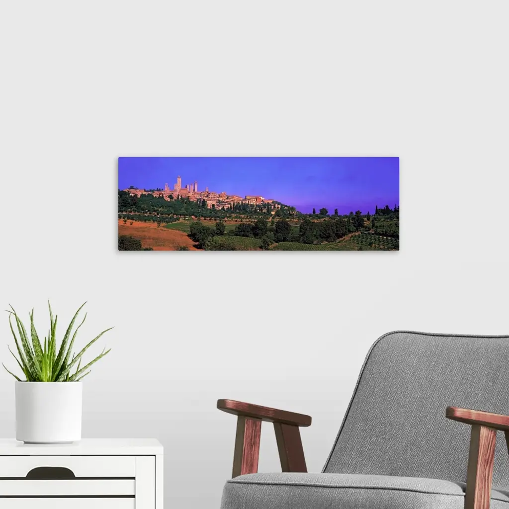 Wide angle photograph of San Gimignano in the distance, against a vibrant sky. Green landscape and a vineyard in the foreground, in Tuscany, Italy.