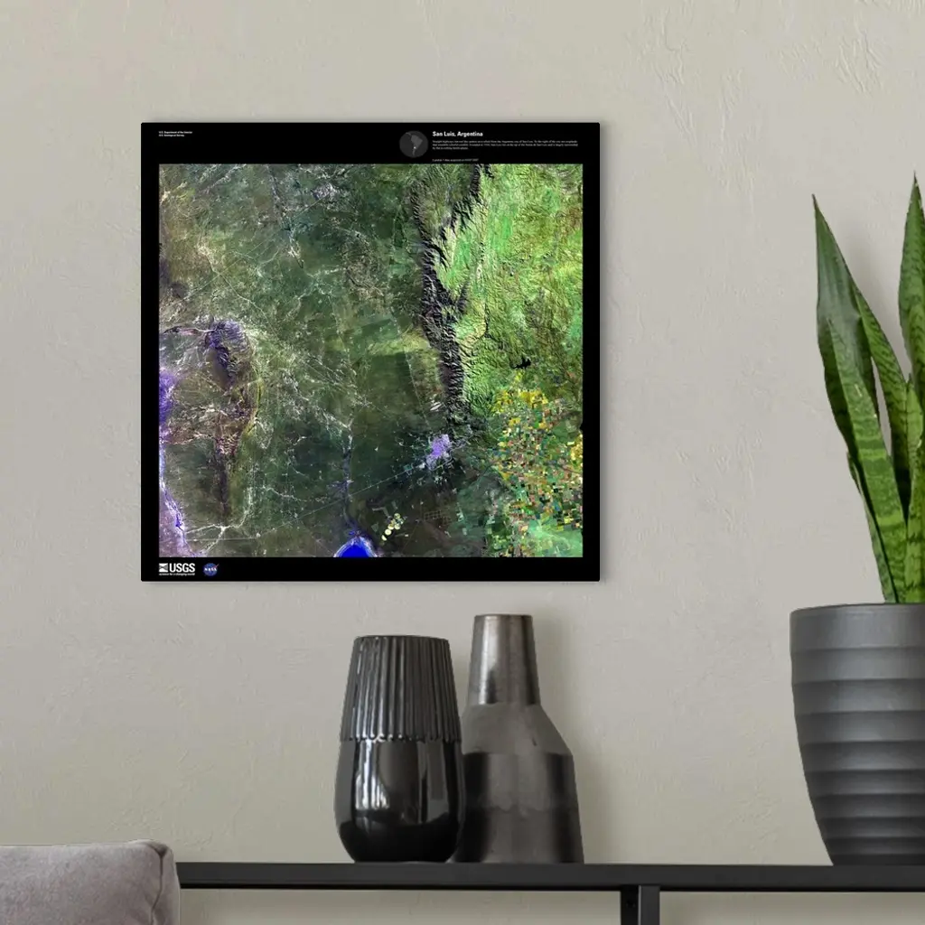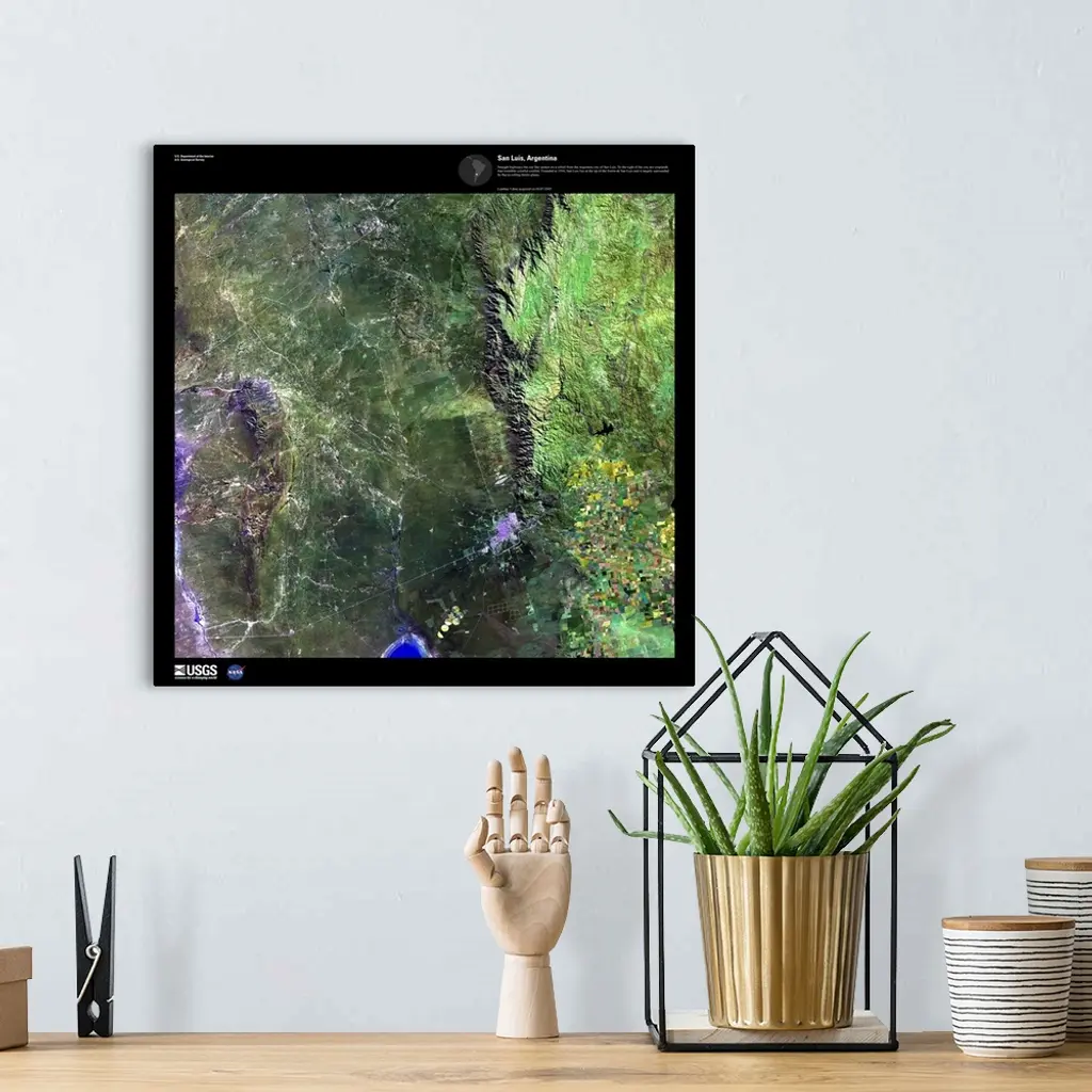 Straight highways fan out like spokes on a wheel from the Argentine city of San Luis. To the right of the city are croplands that resemble colorful confetti. Founded in 1594, San Luis lies at the tip of the Sierra de San Luis and is largely surrounded by flat-to-rolling fertile plains. April 7, 2007.