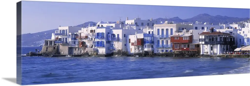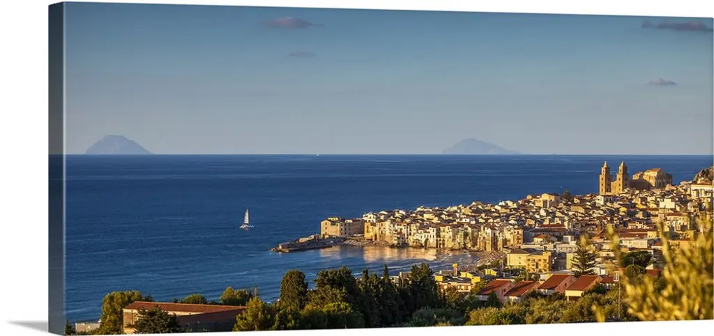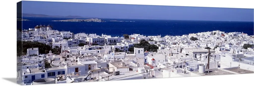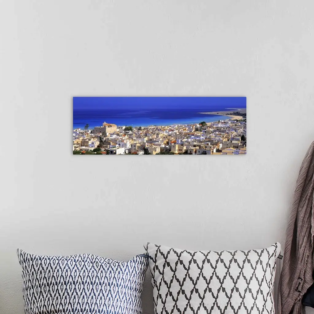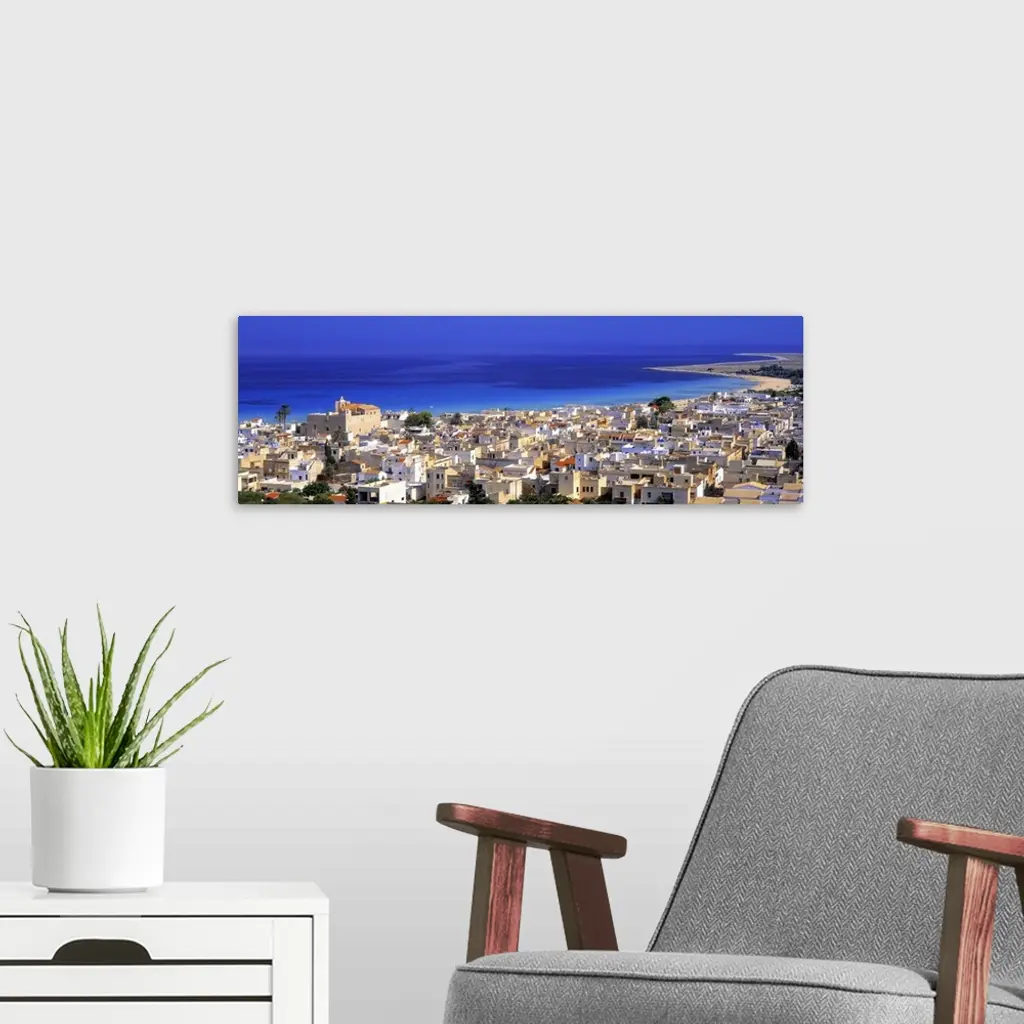 This is a landscape photograph of a coastal village and the sea beyond it in this panoramic wall art.