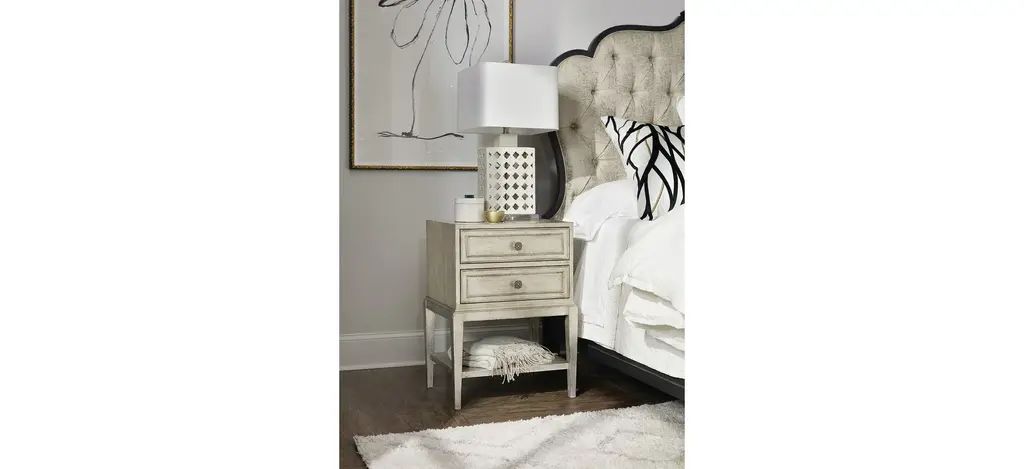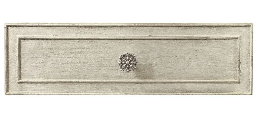 With a luxurious platinum patina and refined design, the versatile Sanctuary Telephone Table is proof that good things come in small packages. Delightfully functional, the table includes a power bar with 3 electrical outlets and one live USB port. The top drawer has a removable cream-colored felt liner, while the bottom drawer has a cedar-lined bottom. Crafted of Poplar and Hardwood Solids with Oak Veneers, the Gemme is finished in Jewel, a silver with rich undertones of gold and champagne. The decorative jewelry-like hardware is in an antique silver color.