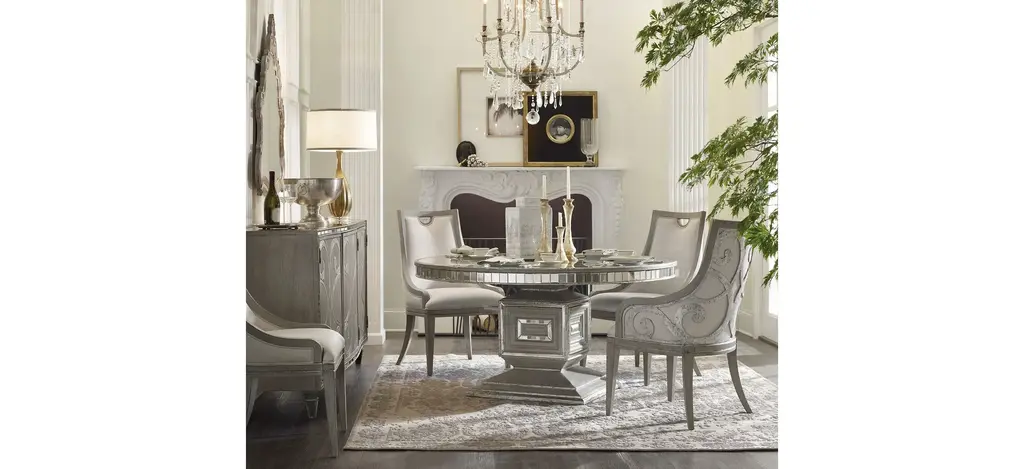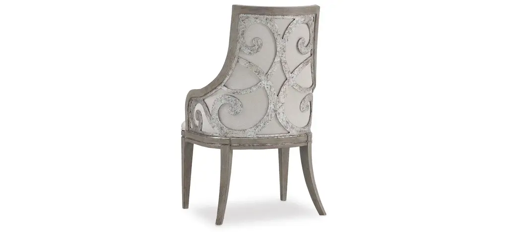 Pamper yourself in this Sanctuary upholstered arm chair - set of 2 that is as comfortable as it is opulent, featuring a luxe scrolled fretwork overlay on the back. The inviting fabric seat and back is upholstered in shimmering fabric, and the chair is finished with shimmer on veneers.