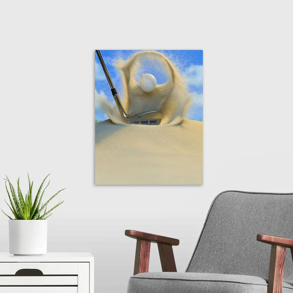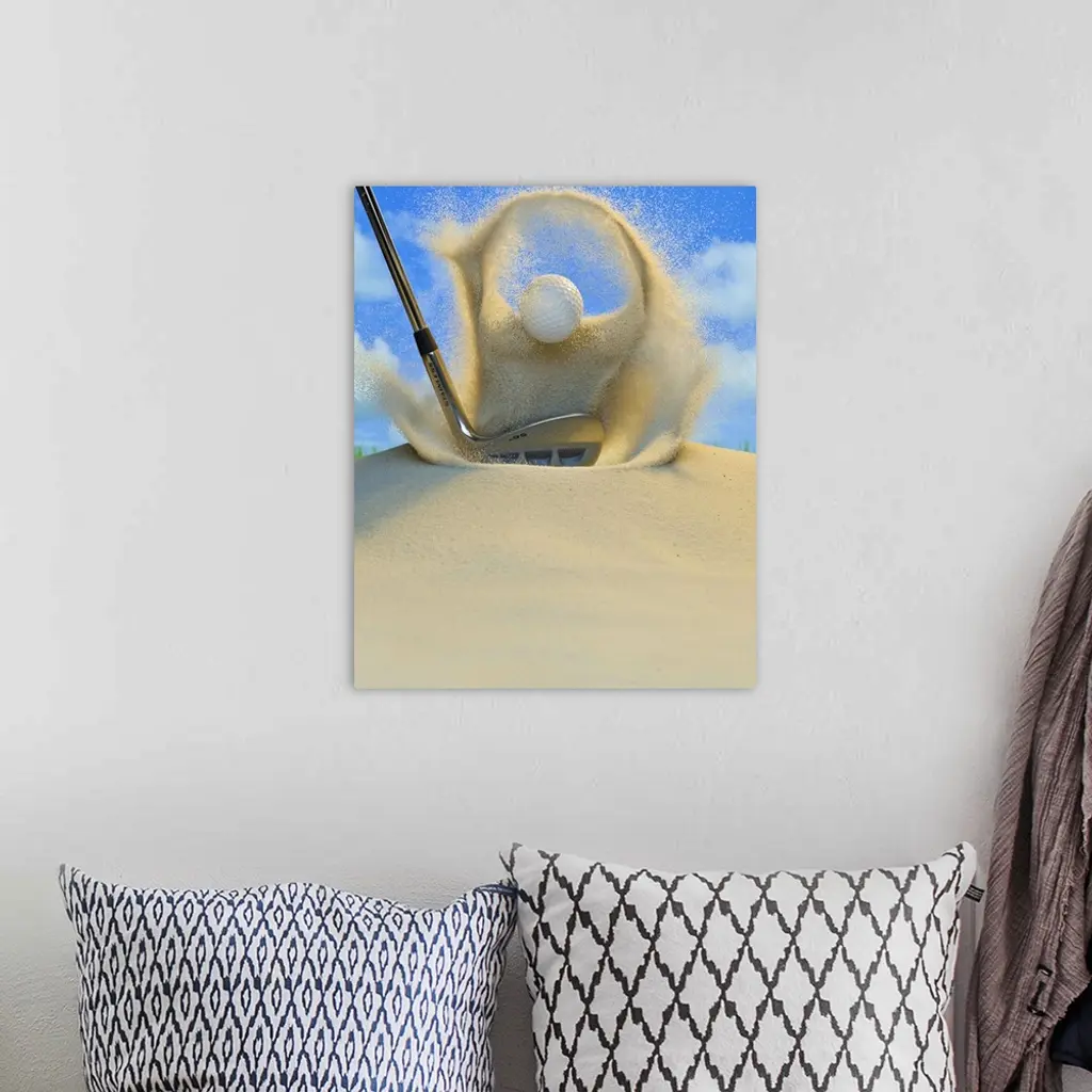 Sand wedge hitting a golf ball out of a sand trap wall art for home and office decor. Discover canvas art prints, photos, mural, big canvas art and framed wall art in GreatBigCanvas.com's varied collections.