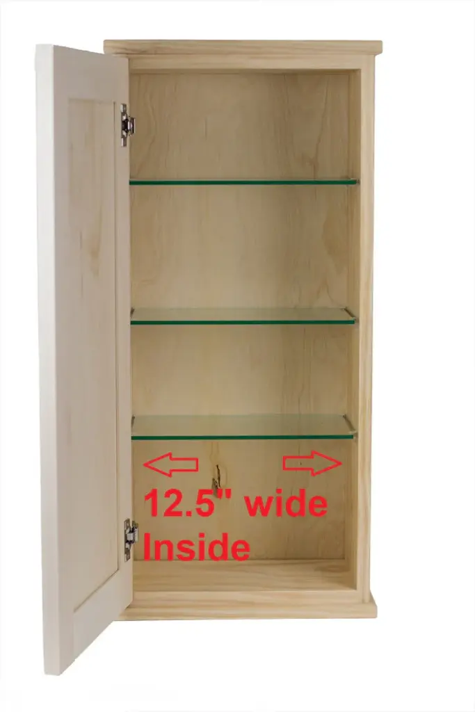 Mounts on the wall with steel mounting brackets inside for an easy installation. With two mounting methods, there is no need to worry about where the studs are in the wall. Three fully adjustable glass shelves slide into our patented shelf supports so they don''t tip or rock. Shaker style panel door sits on concealed hinges with soft close feature, door is reversible so you can mount it to open either direction. Perfect as a medicine cabinet, spice cabinet, or storage cabinet anywhere. OVERALL Measurements are 19.5h x 15.25w x 4.25"d OVERALL. You''ll have nearly 3.5" of depth INSIDE the cabinet. Primed and ready for you to paint it. Solid pine cabinet box with solid maple door. Proudly made in the USA.