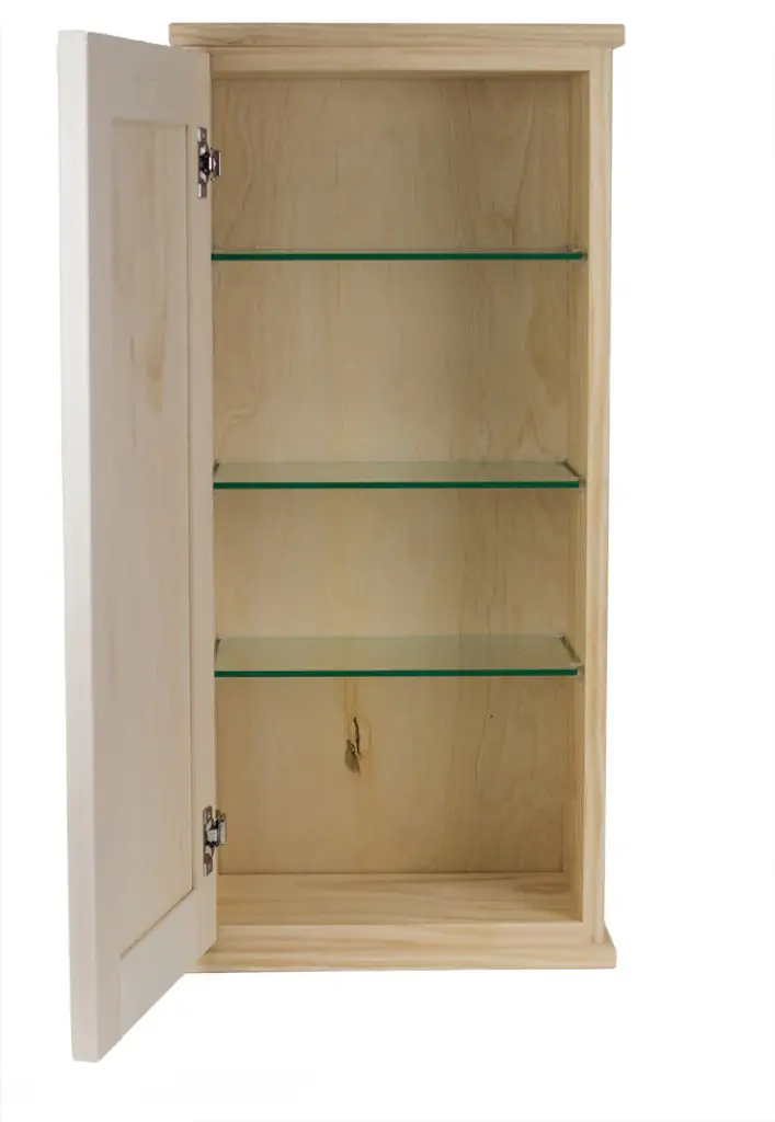 Mounts on the wall with steel mounting brackets inside for an easy installation. With two mounting methods, there is no need to worry about where the studs are in the wall. Three fully adjustable glass shelves slide into our patented shelf supports so they don''t tip or rock. Shaker style panel door sits on concealed hinges with soft close feature, door is reversible so you can mount it to open either direction. Perfect as a medicine cabinet, spice cabinet, or storage cabinet anywhere. OVERALL Measurements are 19.5h x 15.25w x 5.25"d OVERALL. You''ll have nearly 4.5" of depth INSIDE the cabinet. Unfinished bare wood can be painted or stained as desired. Solid pine cabinet box with solid maple door. Proudly made in the USA.