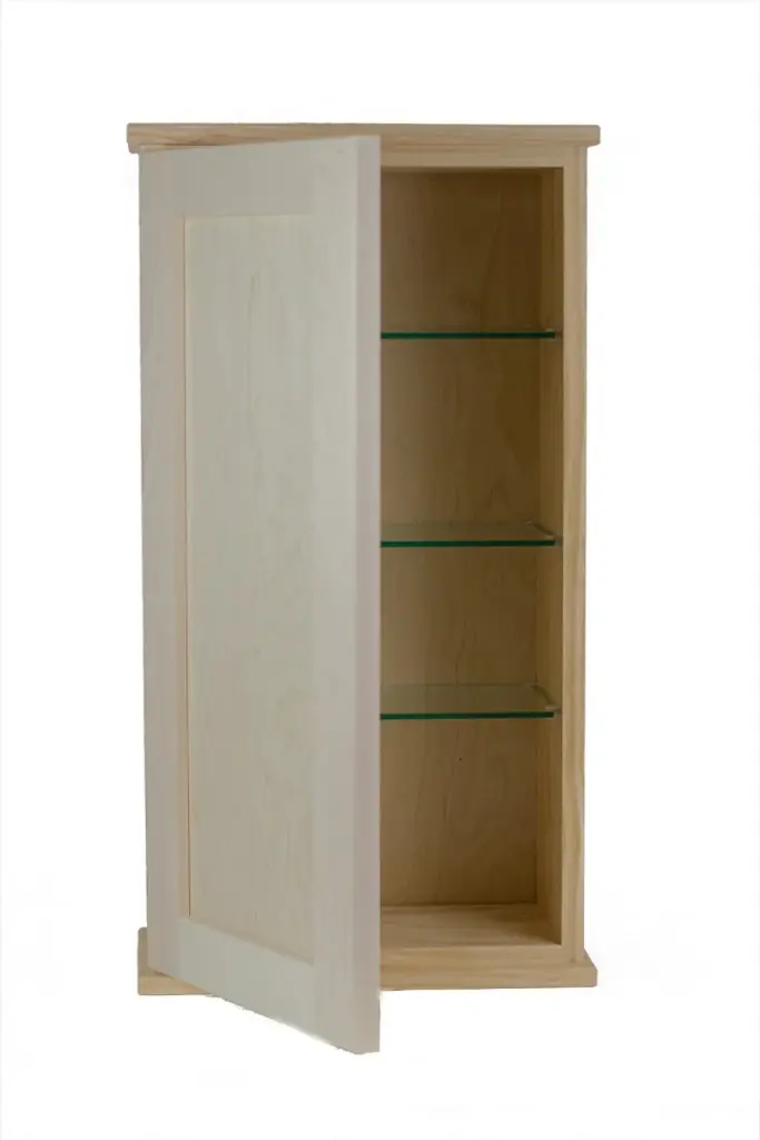 Mounts on the wall with steel mounting brackets inside for an easy installation. With two mounting methods, there is no need to worry about where the studs are in the wall. Three fully adjustable glass shelves slide into our patented shelf supports so they don''t tip or rock. Shaker style panel door sits on concealed hinges with soft close feature, door is reversible so you can mount it to open either direction. Perfect as a medicine cabinet, spice cabinet, or storage cabinet anywhere. OVERALL Measurements are 19.5h x 15.25w x 6.25"d OVERALL. You''ll have nearly 5.5" of depth INSIDE the cabinet. Unfinished bare wood can be painted or stained as desired. Solid pine cabinet box with solid maple door. Proudly made in the USA.
