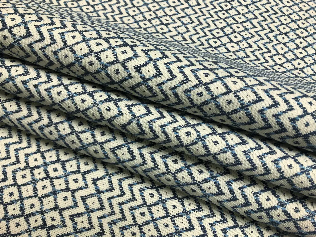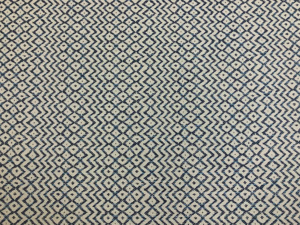54" wide designer water & stain resistant ethnic geometric upholstery fabric in navy blue and ivory. Price is per yard.