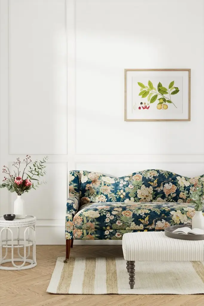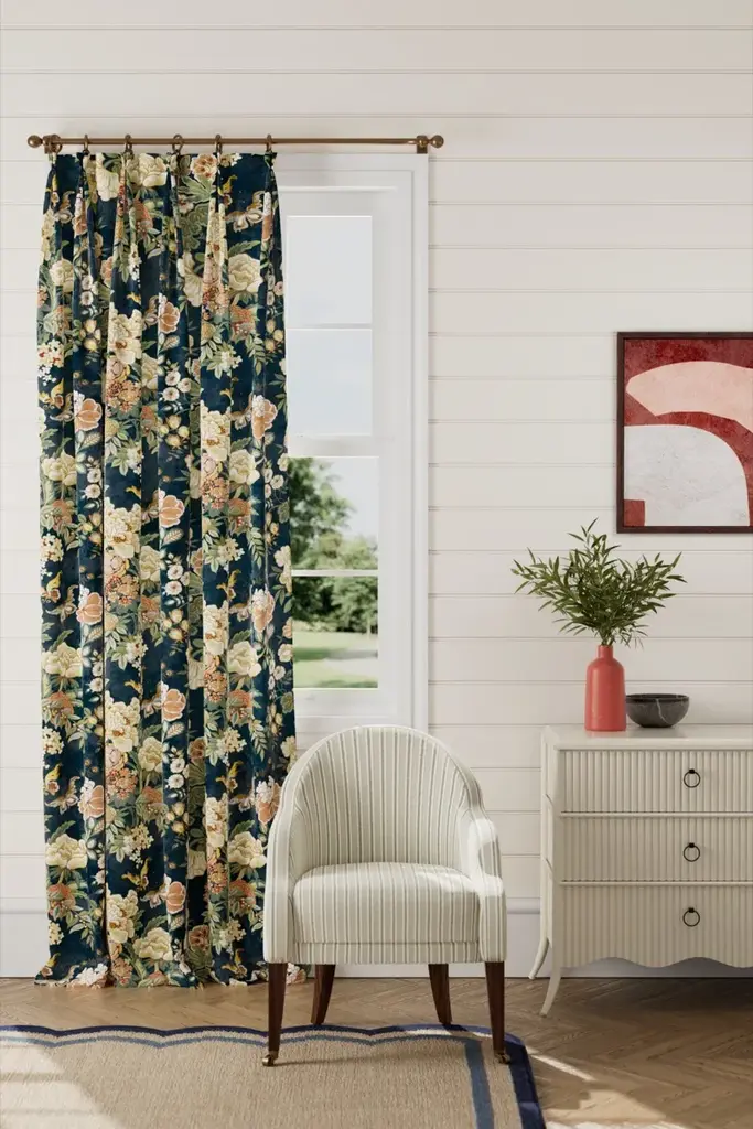 In contrast to its blousy Victorian contemporaries the Chinese inspired decorative style of this 1920’s Jeffrey & Co. archive design is adorned with large peonies and tropical butterflies. Printed on 100% linen and with a velvet Midnight coloured alternative it’s a beautiful choice for upholstery. 83% Cotton 17% Polyester. Sold by the yard. Part of the WATER GARDEN Collection. Vertical Repeat: 27.5590551181102 Horizontal Repeat: 52.1653543307087 Aftercare Codes: No Machine Wash - SDC / No Ble / No tumb / No Iron / SDC (Spec) This item is non-refundable, but swatches are available for purchase. Colors can vary from screen to screen; we recommend ordering a swatch before placing your full size purchase. For any questions, please reach out to swatches@chairish.com