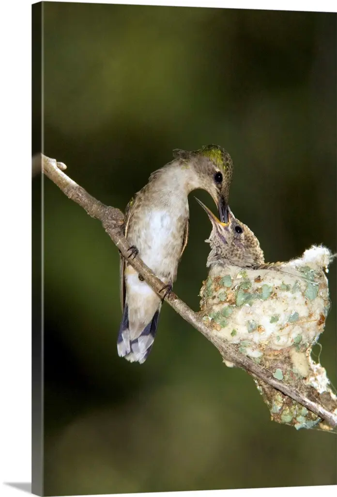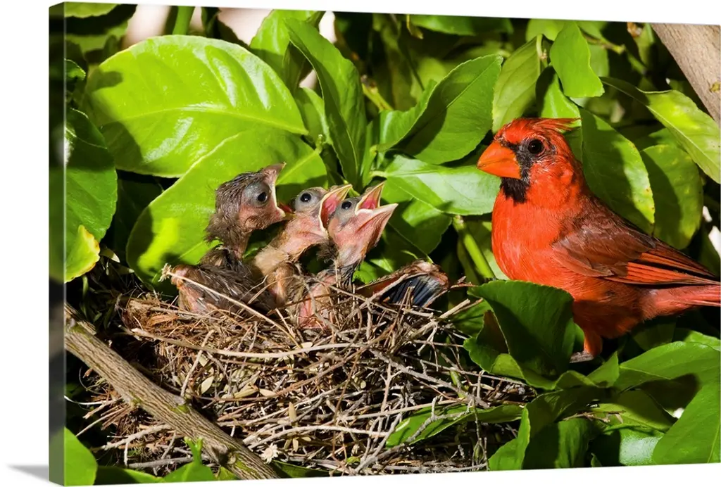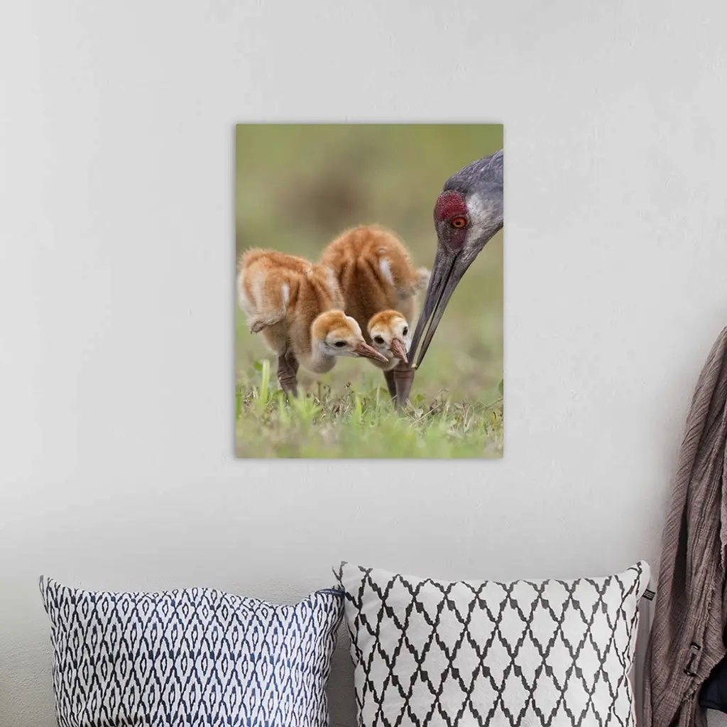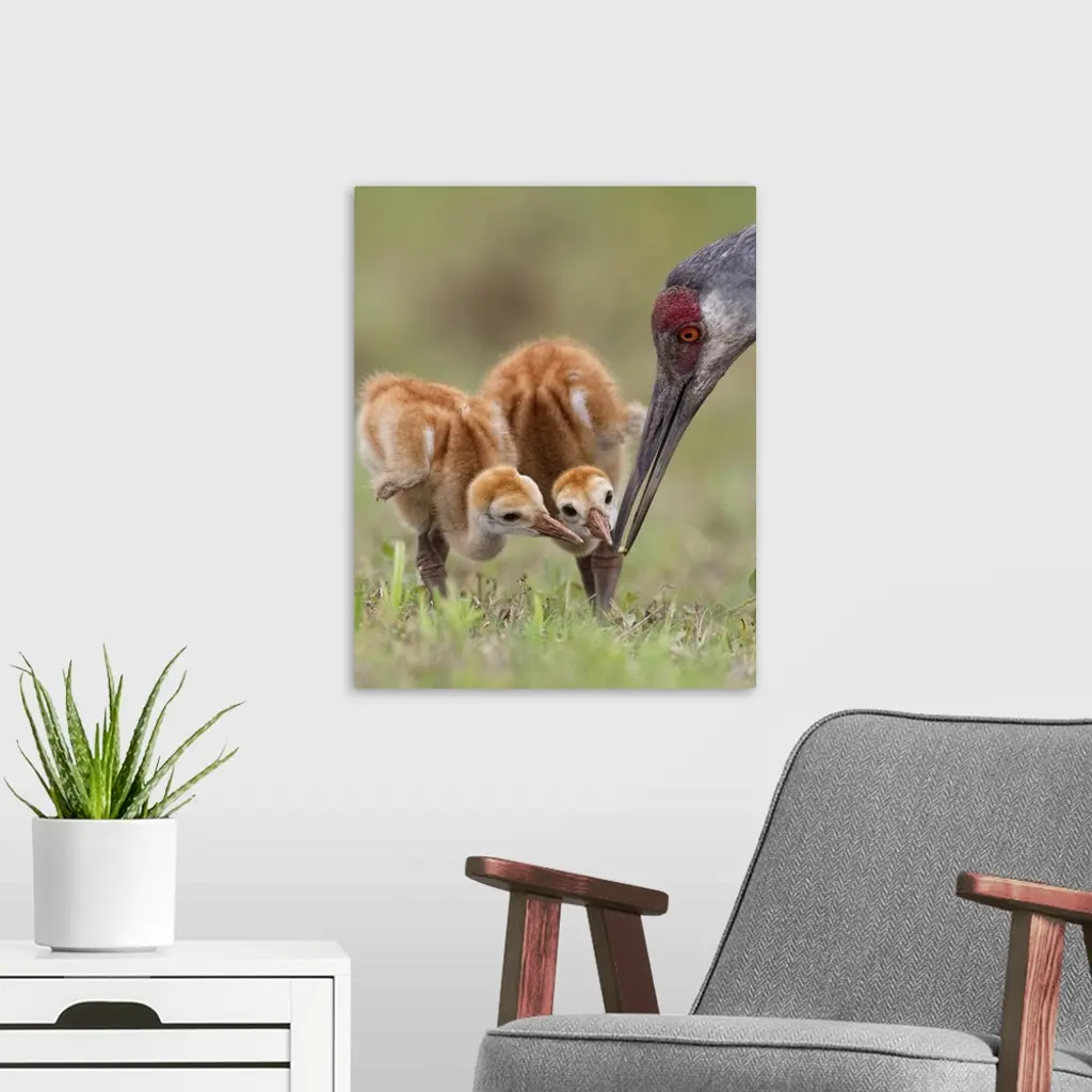 A portrait of two baby sandhill cranes nuzzling beaks with their mother.