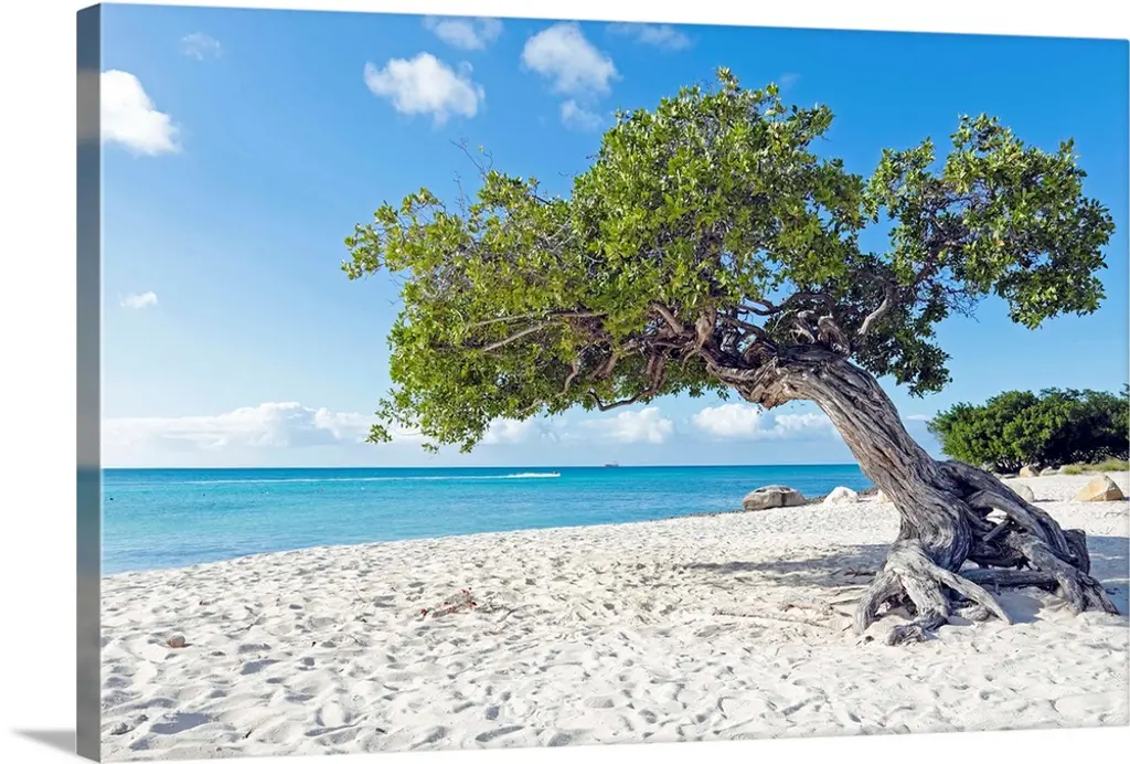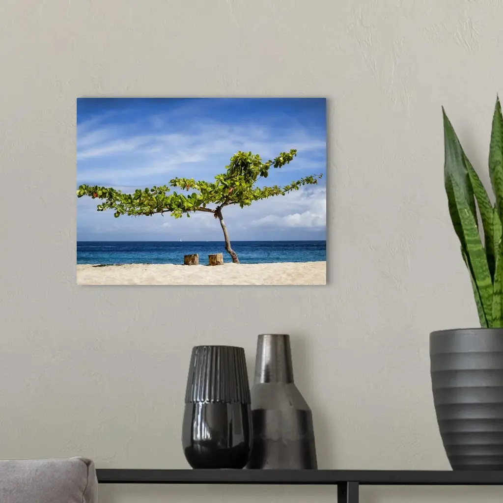 A tree and two tree stumps for seats on a sandy beach with a view of the blue ocean, Caribbean