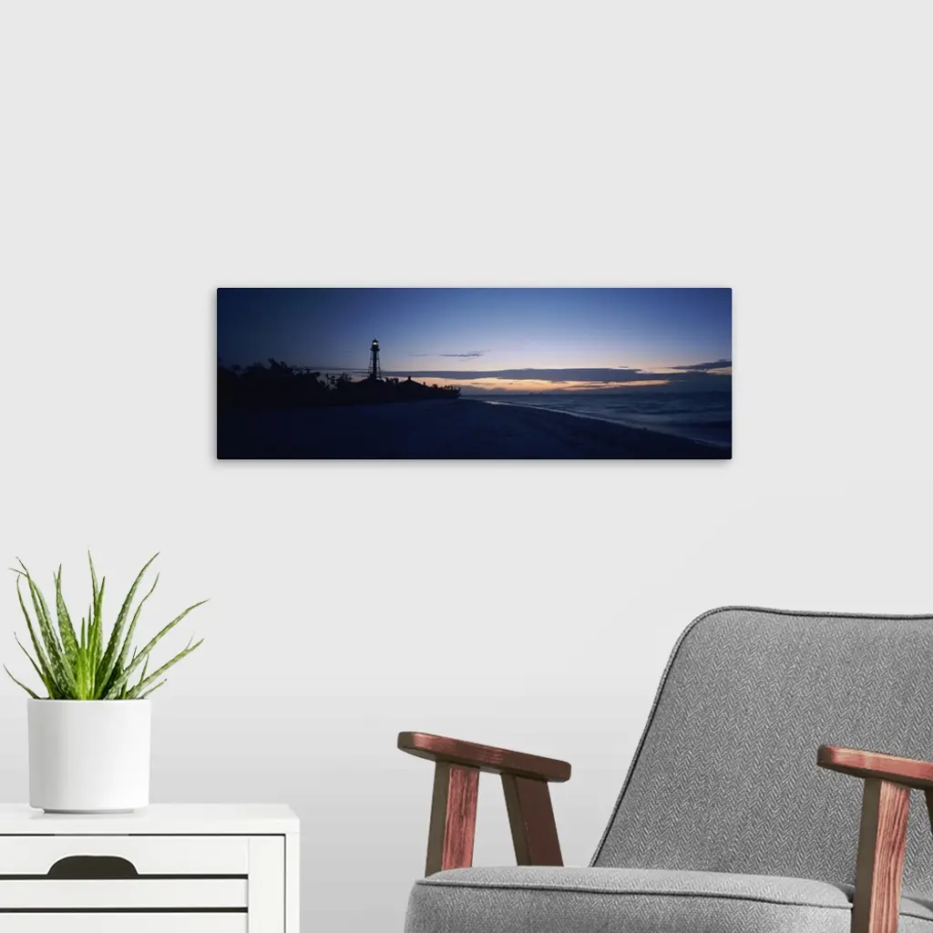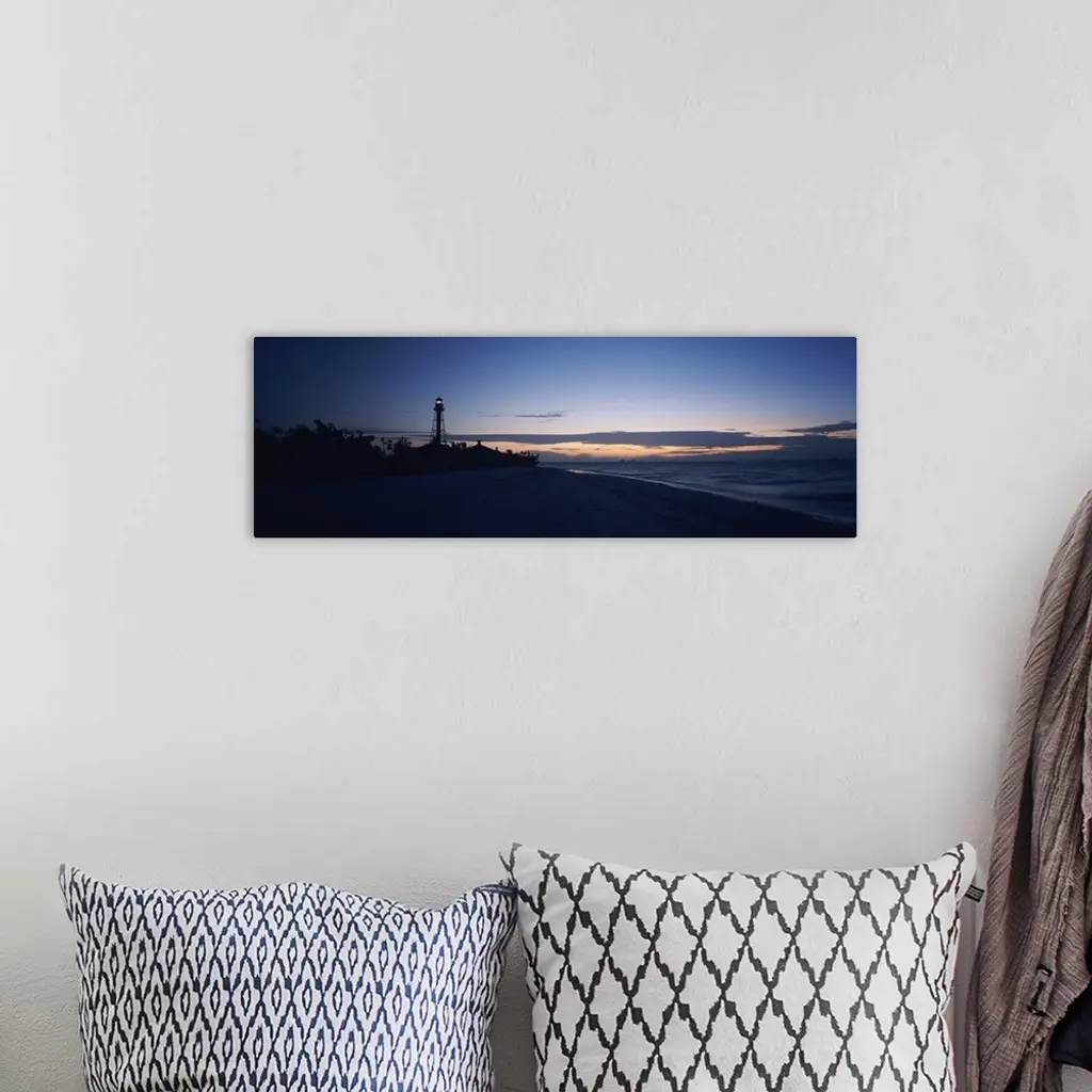 Wide angle photograph on a large canvas of the shoreline at Sanibel Island, in the darkness of early dawn, the Sanibel Island lighthouse in the distance, in Fort Myers, Florida.