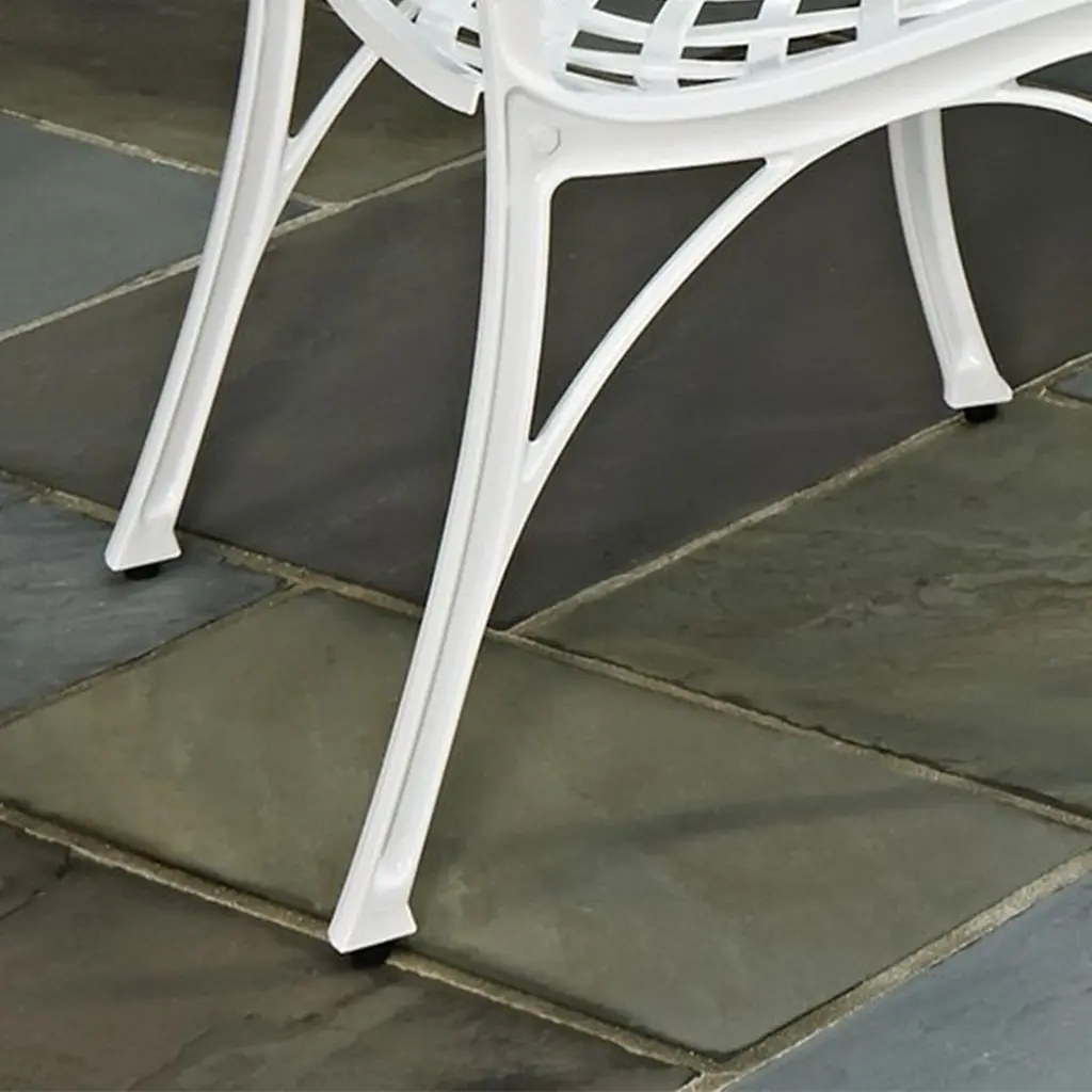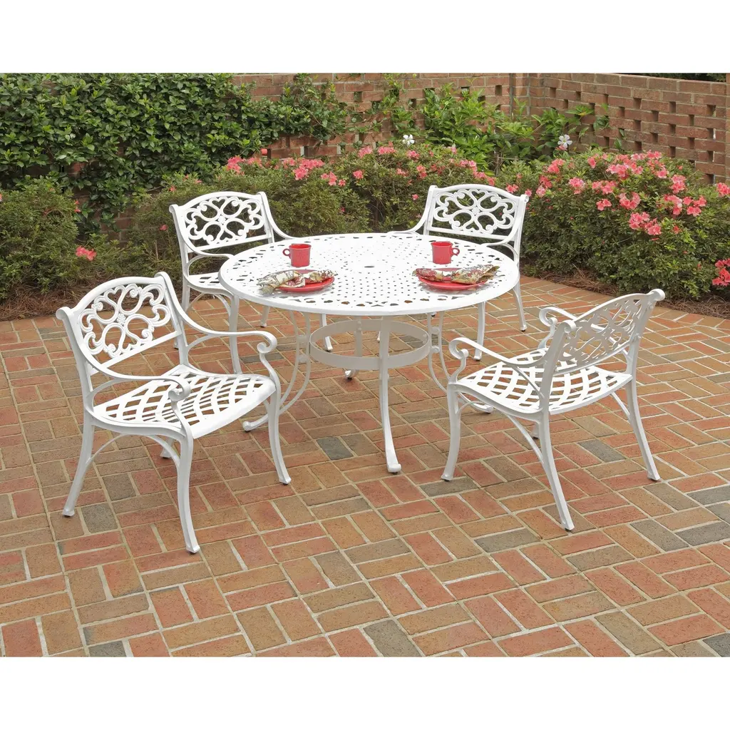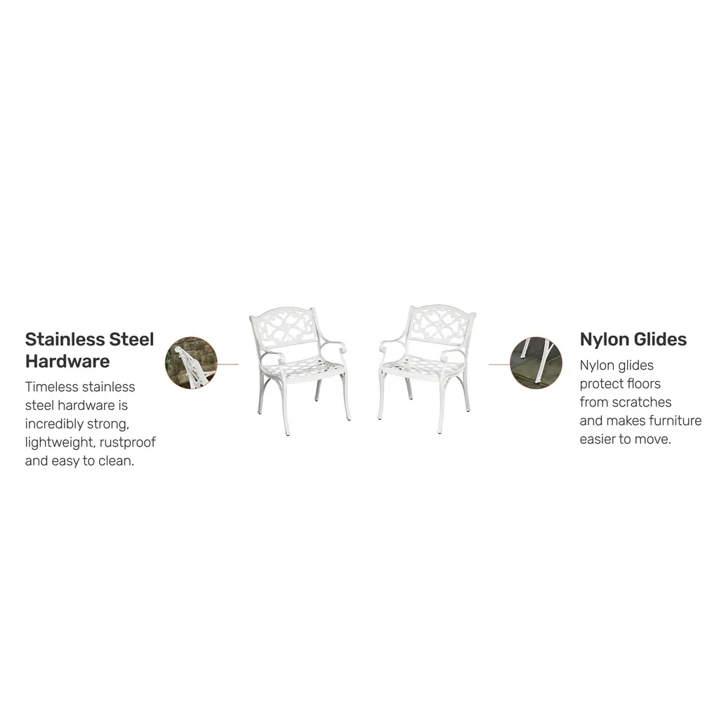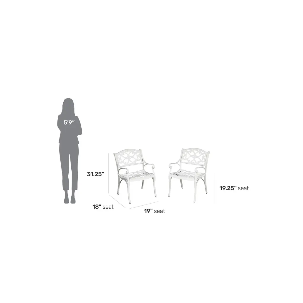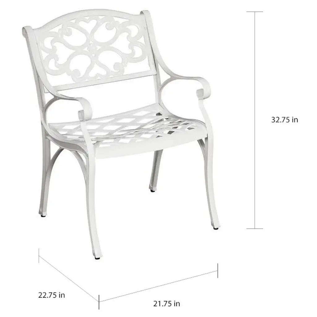 Enjoy the outdoors in sturdy style with these Sanibel chairs by Homestyles. The white powder-coated aluminum frames feature cut-out seat backs and scrolled arms. Criss-cross seats ensure breathability on hot summer days.Features: