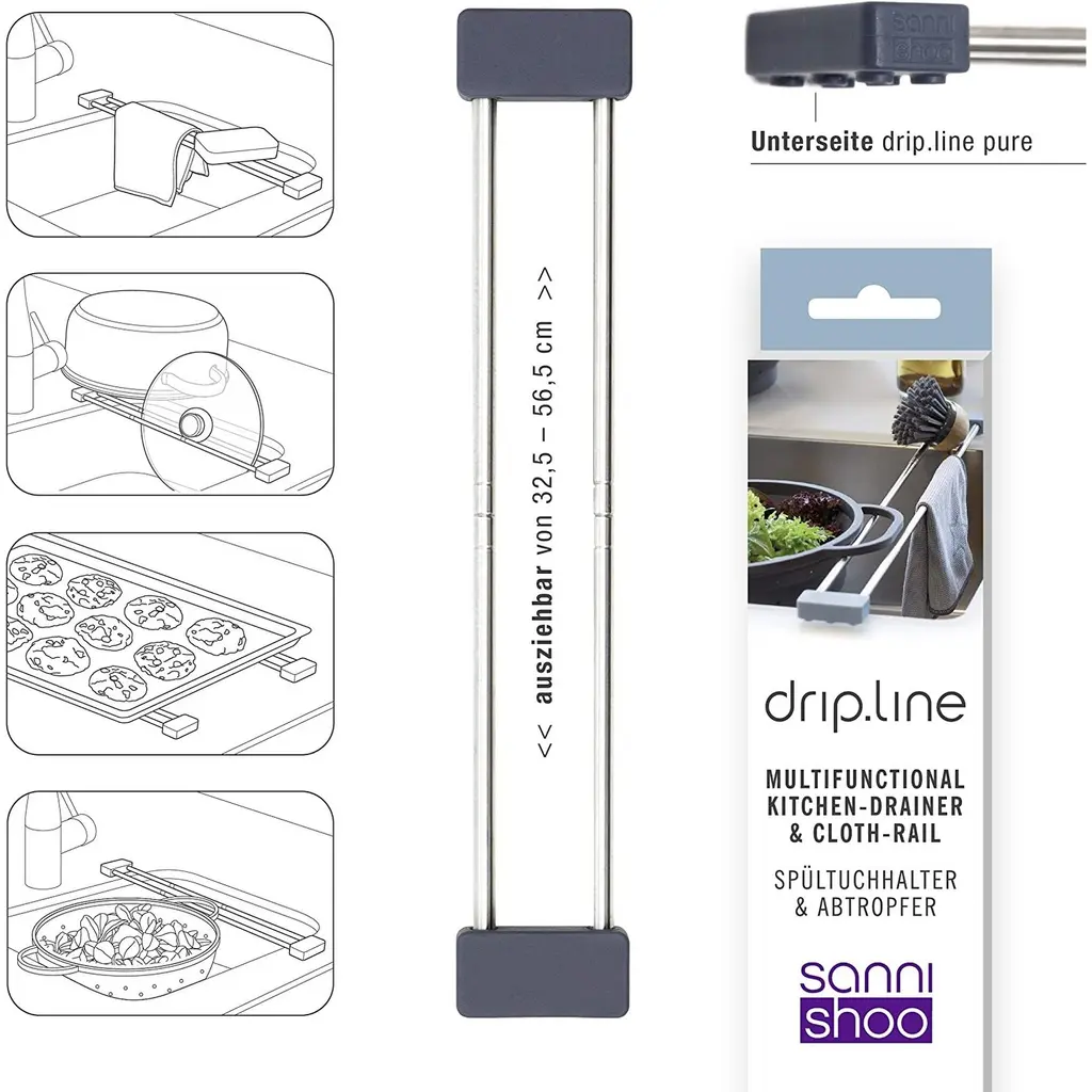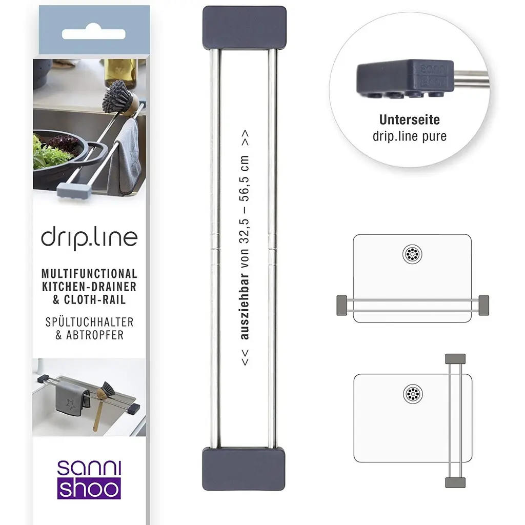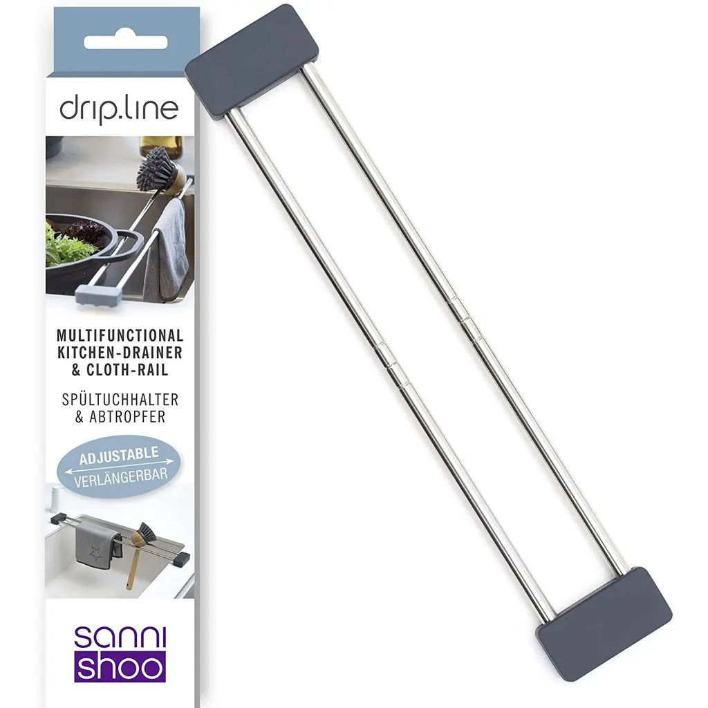 Sanni Shoo drip.line Multifunctional Kitchen Drainer & Cloth Rail - NewEver been annoyed by the dishcloth hanging from the faucet? Even about the messy, wet sponge lying around in the sink? Studies prove it: Both are the biggest germ traps in the kitchen, and drip.line has something to help: The smart telescopic sink caddy made of stainless steel and silicone allows dishcloth and sponge to dry airy and hygienic after a proper wash. Due to the telescopic function, drip.line fits any sink, and can be easily placed on the side or back of it without fixing. Adjustable from 12.79 inches (32.5cm) to 22.24 inches (56.5 cm).FEATURES:COLOR:MATERIAL:WHAT'S IN THE BOX:PACKAGING: Retail Packaging