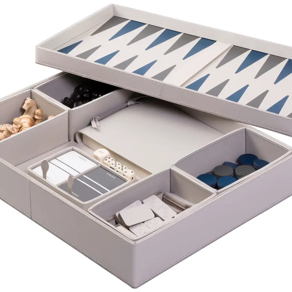 Crafted using traditional methods of water-resistant saddle leather, this games compendium is a superb accent for a modern home. The exterior resembles a striking box with lid with an eye-catching pattern that can be used as a draughts board, while the bottom of the box features a backgammon board. The inside of the box reveals a precious set of boxwood chess pawns, saddle leather draughts, saddle leather domino pieces, two decks of high-quality playing cards, four standard dice, one doubling cube, and one Legacci notebook with saddle leather cover.