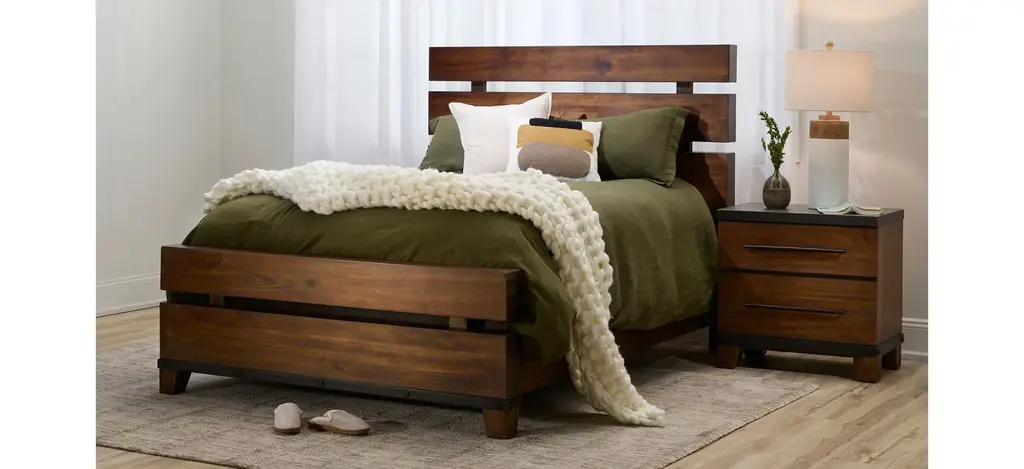 Set the stage for designing an oasis of comfort and appeal with the Santa Cruz queen bed. A warm, medium-toned finish with beautiful acacia veneers characterize this bed's quaint beachside charm. The attractive panel-style headboard and footboard enhance the natural features providing an elevated, polished touch.