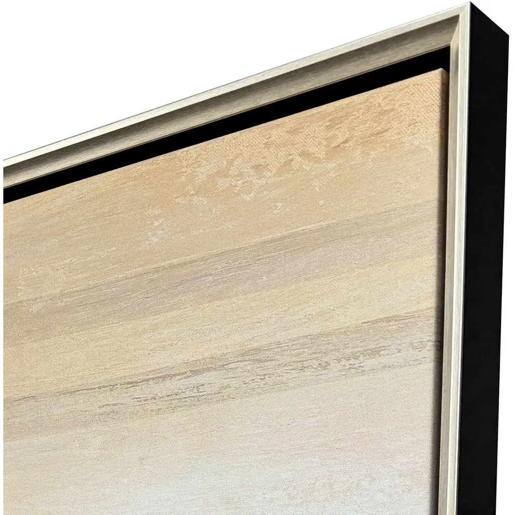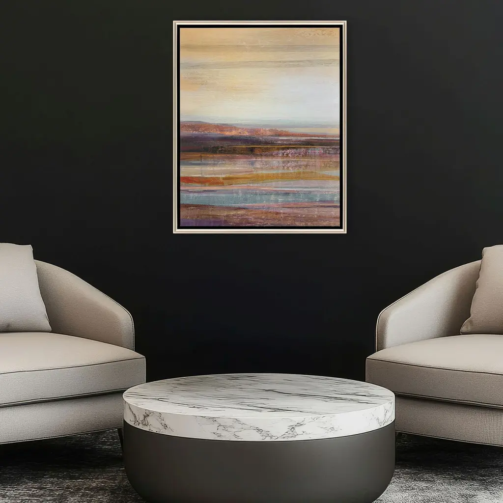 A gorgeous Southwestern color palette infuses a captivating landscape. Canvas is mounted in a warm silver floater frame with satin black side.