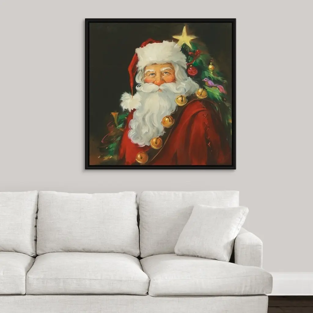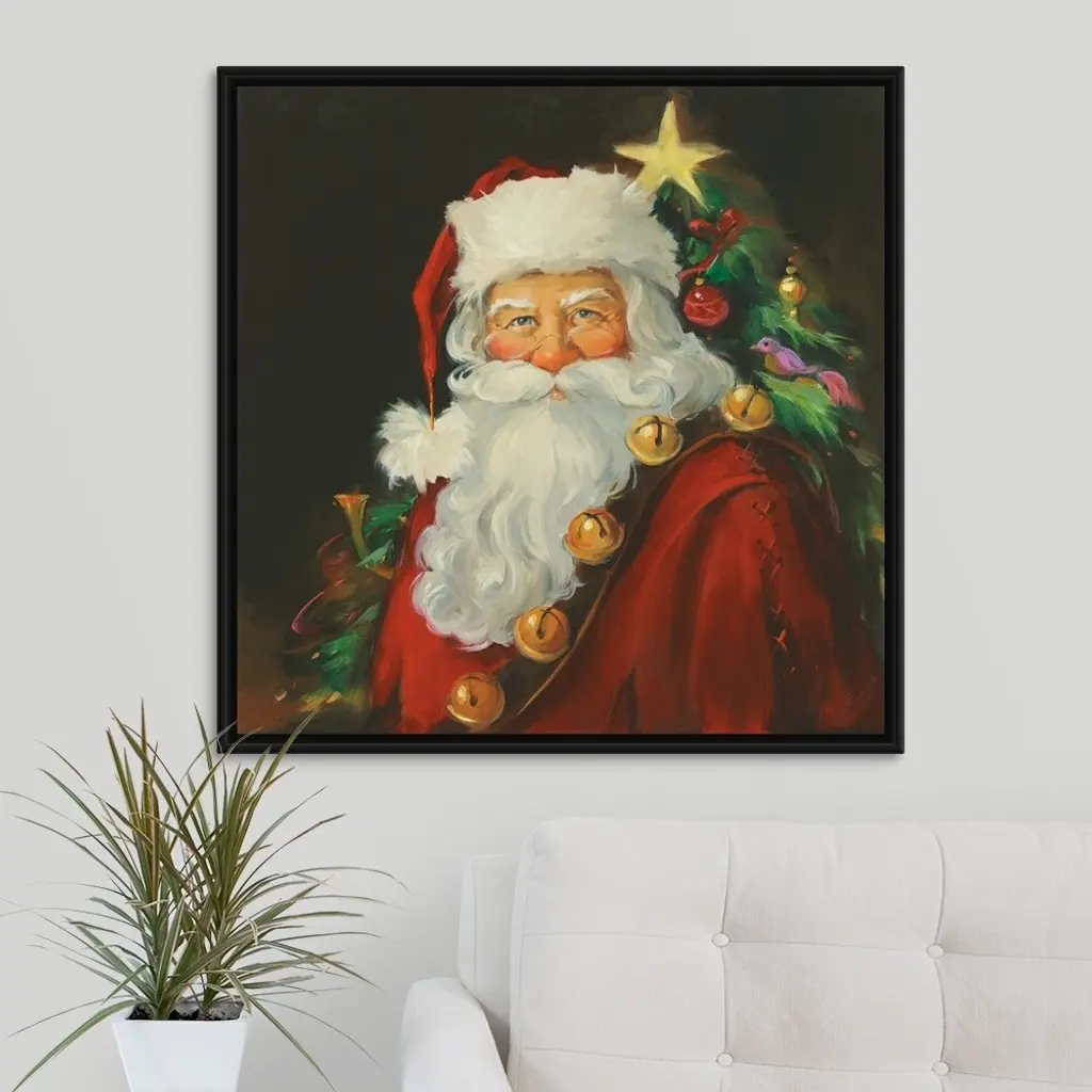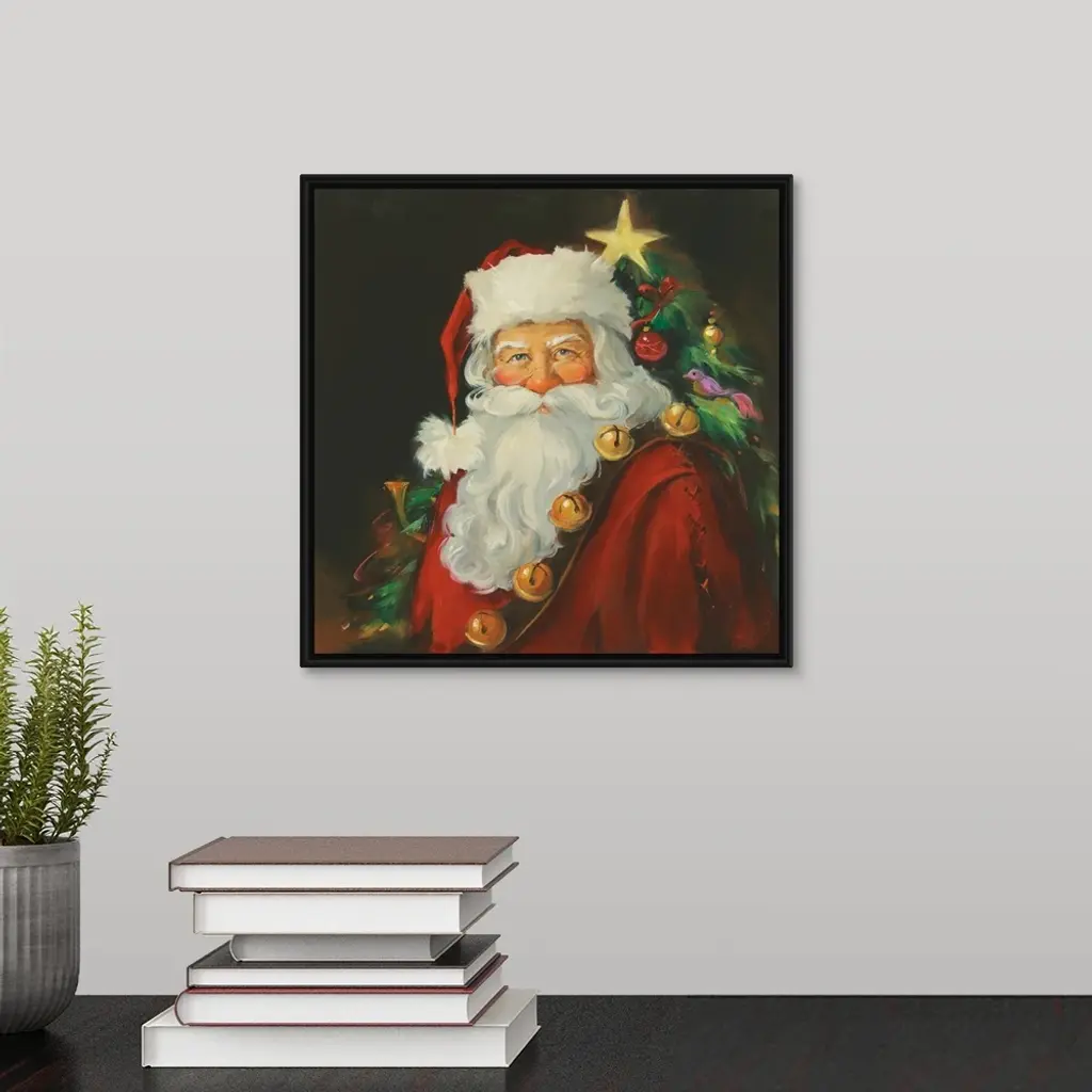 Floating Frame Canvas Wall Art with Black Frame entitled 'Santa Portrait'. Portrait of Santa with a tree in the background. Multiple sizes available. Primary colors within this image include: Brown, Gray, Peach, Dark Gray. Made in USA. Satisfaction guaranteed. Inks used are latex-based and designed to last.