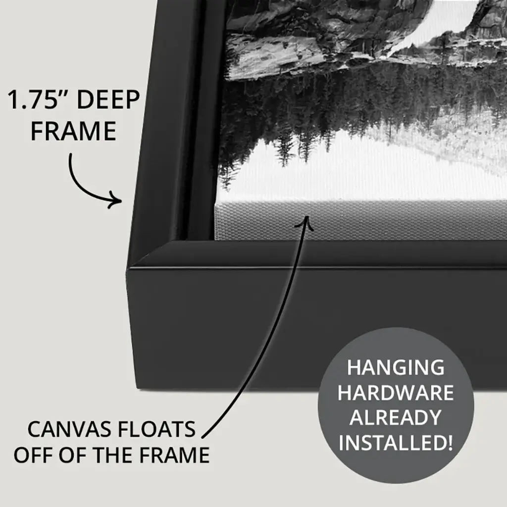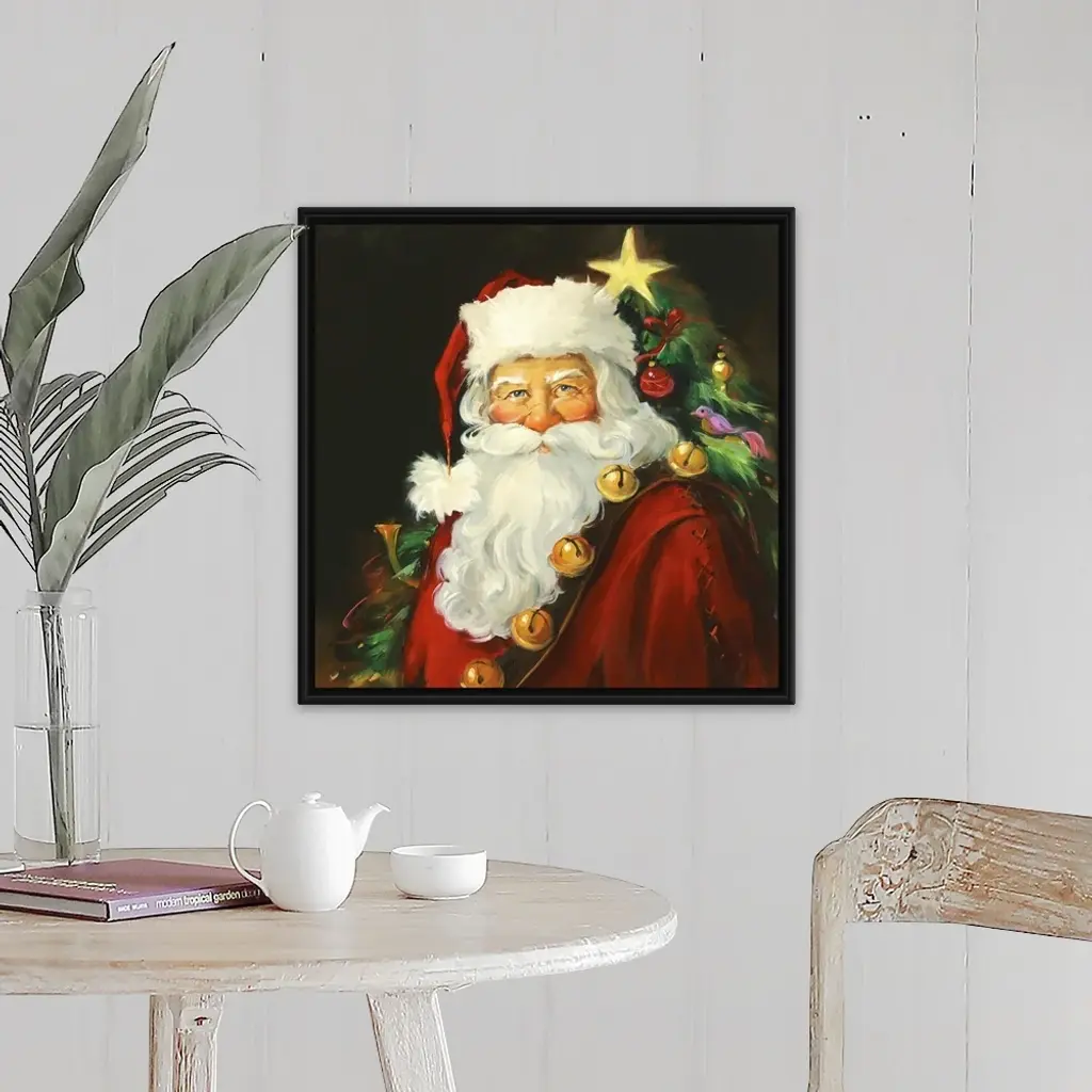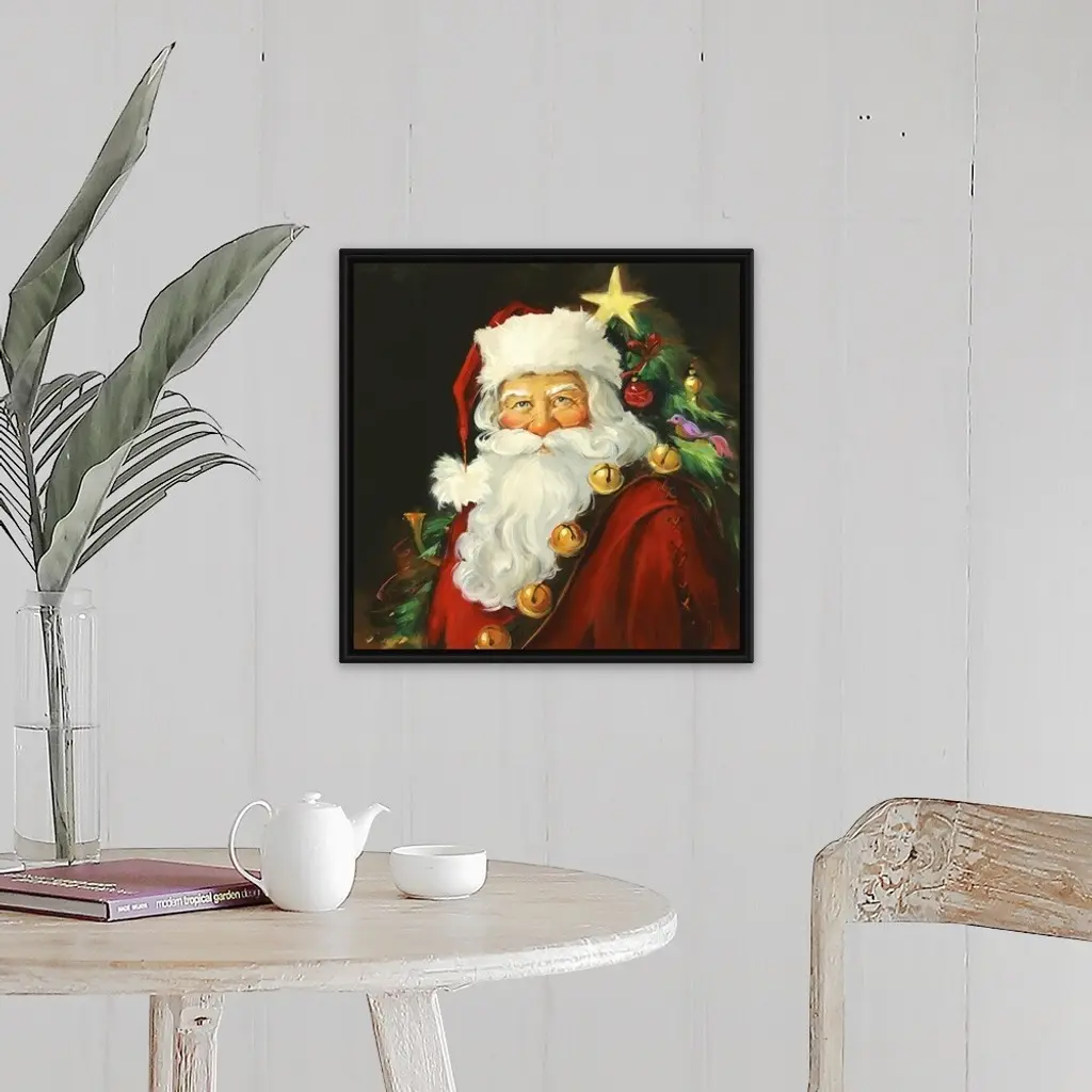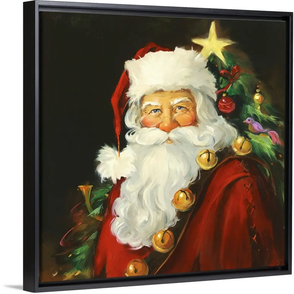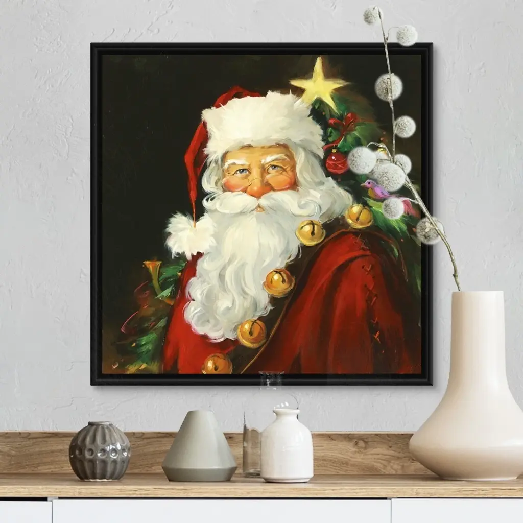 Floating Frame Canvas Wall Art with Black Frame entitled 'Santa Portrait'. Portrait of Santa with a tree in the background. Multiple sizes available. Primary colors within this image include: Brown, Gray, Peach, Dark Gray. Made in USA. Satisfaction guaranteed. Inks used are latex-based and designed to last.