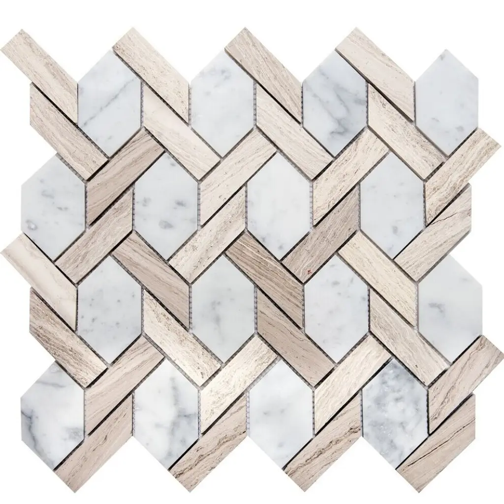 The Tile Life's Santorini Hex boasts a beautiful, braided design that will add movement to any room. A unique design, this product adds a one-of-a-kind flair to any space that you put it in. Available in two stunning colors: Crema/ Light Emperador and Carrara/ Wooden White. FEATURES:DIMENSIONS: