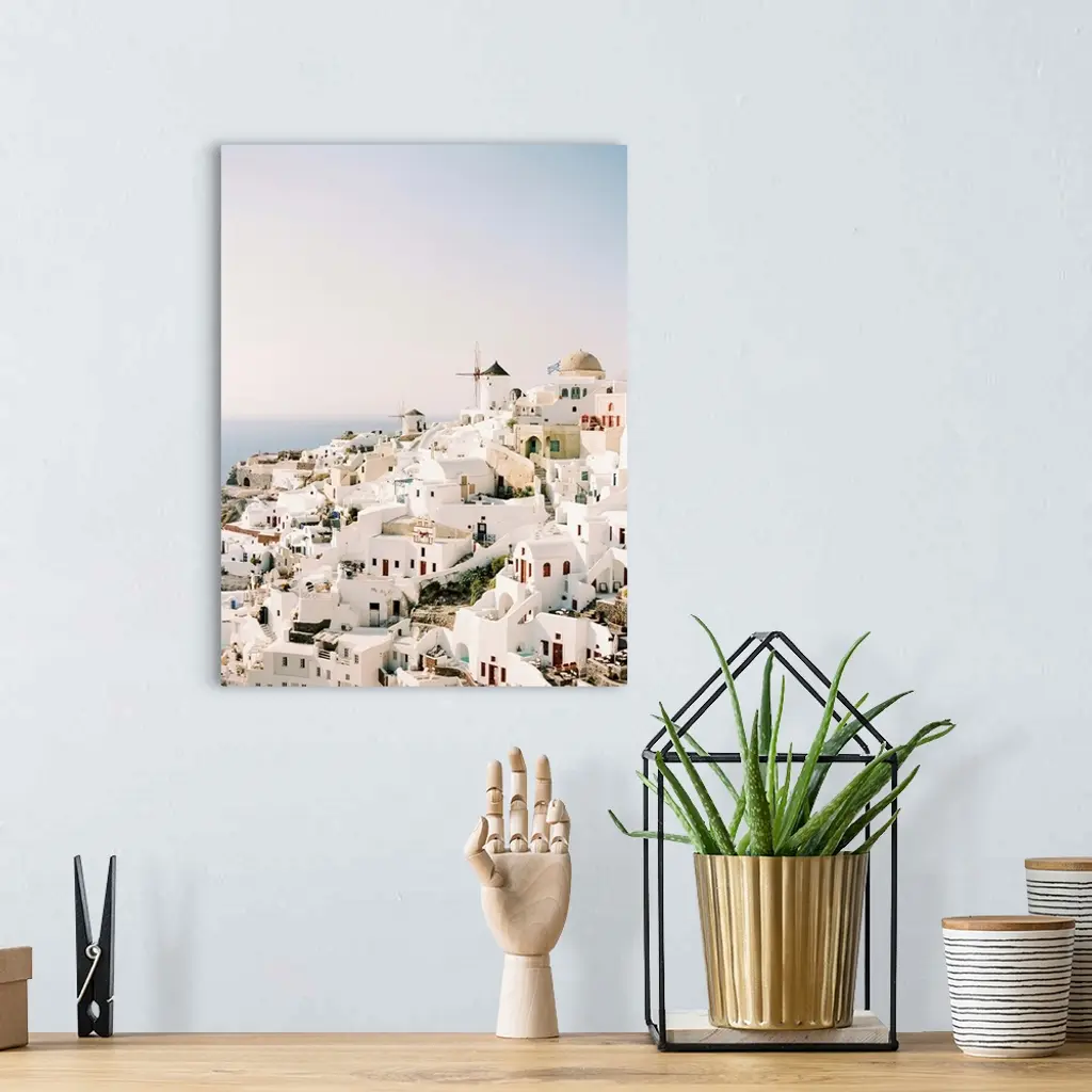 A photograph of the iconic white stucco buildings and windmills that are characteristic of the hillside town of Santorini, Greece.