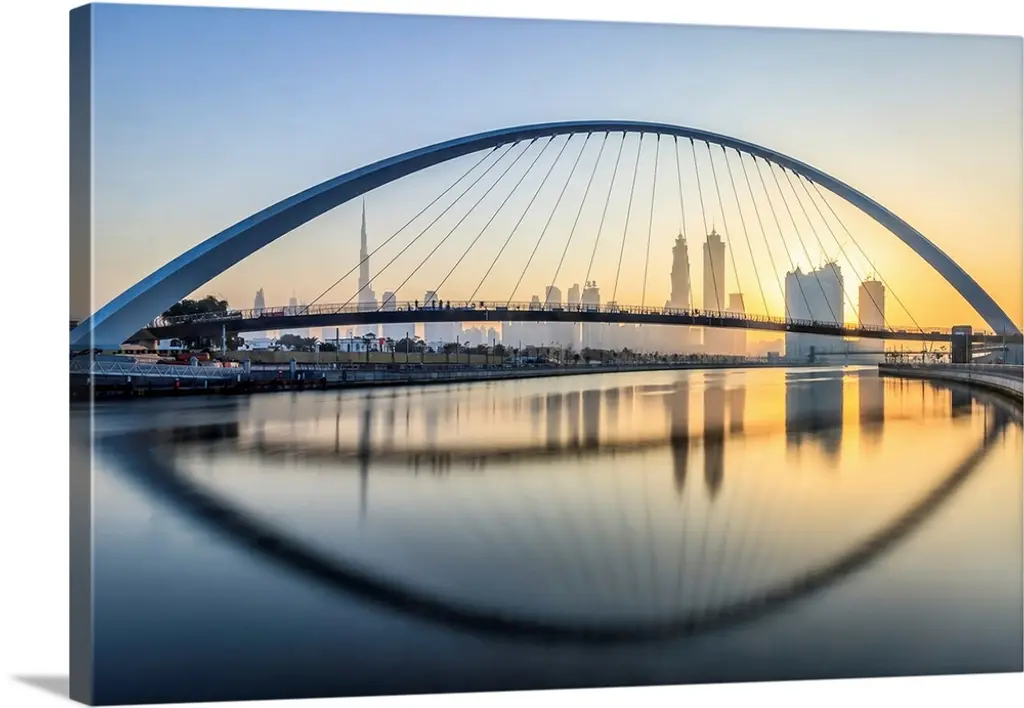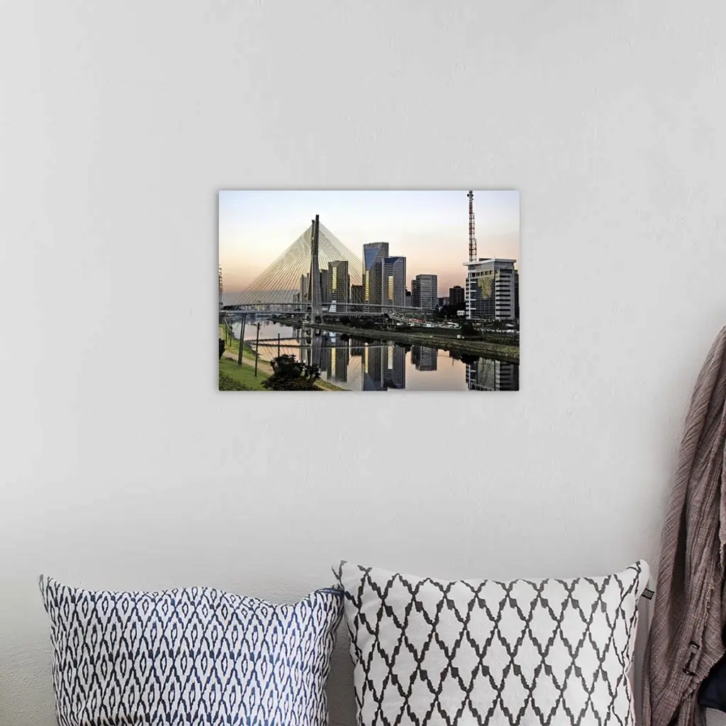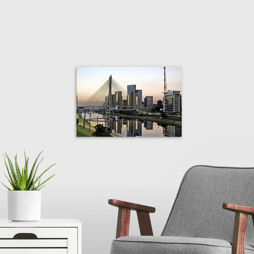 Sao Paulo landmark at dusk. Octavio Frias de Oliveira Stayed Bridge and modern buildings and districts of the skyline.