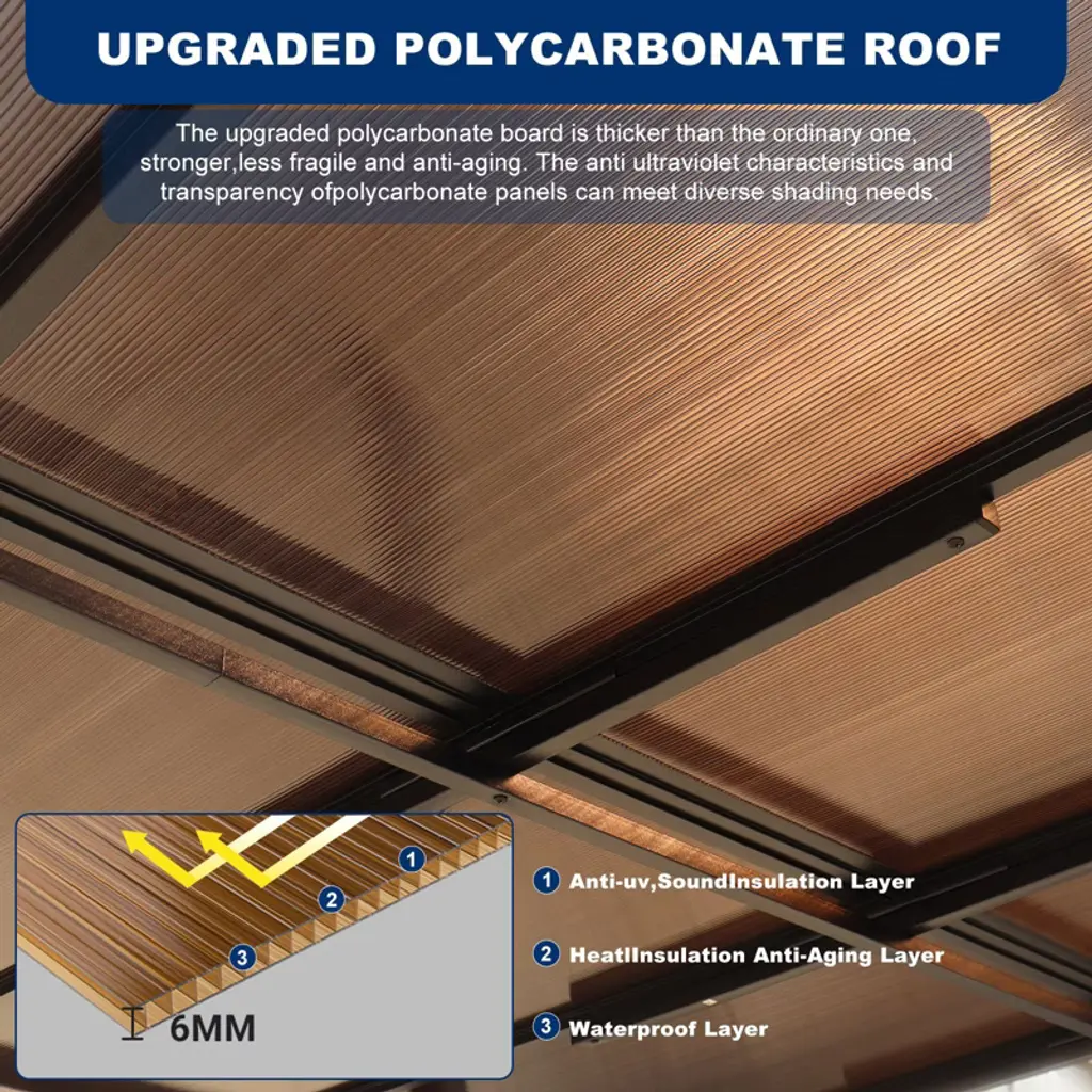 This product has excellent weatherproof performance, and the hardtop structure can effectively resist wind, rain and sun, so you can enjoy outdoor fun all year round. Strong load-bearing capacity, can withstand 60 pounds/square meter of snow. The sloped roof design is waterproof and worry-free. The powder-coated steel frame is rust-proof and paint-proof, and the thick reinforced square legs provide stable support. Suitable for a variety of outdoor scenes, stylish and practical.