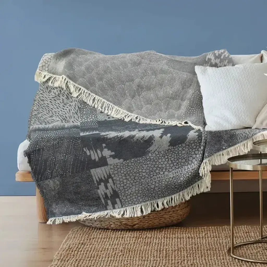 This blanket combines warmth and decoration, with delicate tassels. Its soft hues fit various interior styles, being both practical and a space highlight. Made of recycled cotton with a unique texture, it works well on sofas or beds for warmth or decoration, adding a special charm to homes.