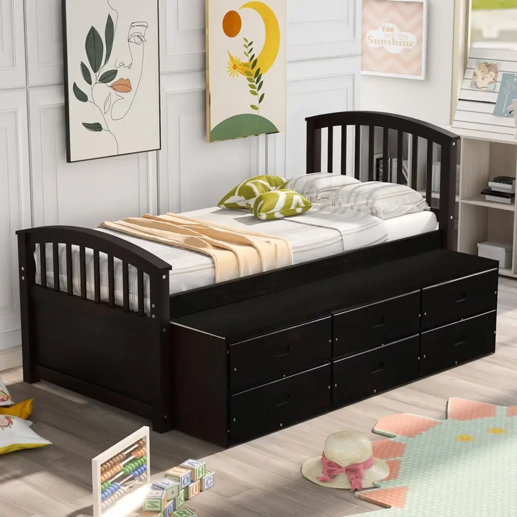 Sapphtopaz Twin Size Bed Frame With Headboard And 6 Drawers, Solid Wood Slats Support Bed, Bedroom Furniture, No Box Spring Needed, Espresso