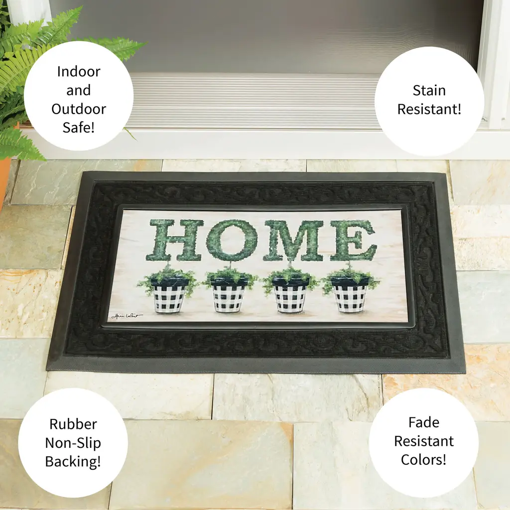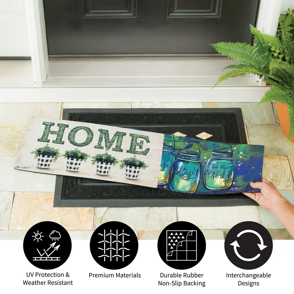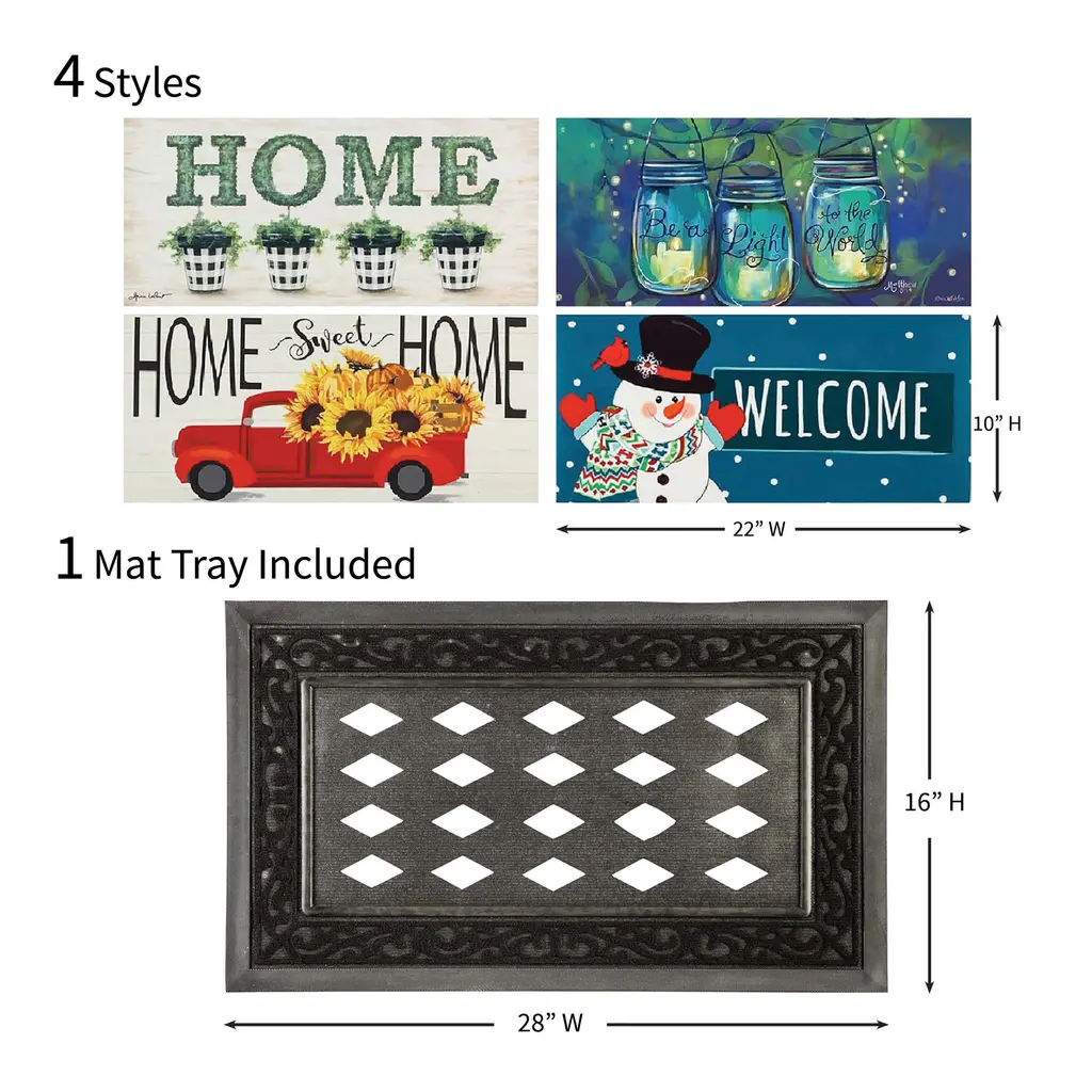 This stunning array includes a mat tray and four seasonal mats in a variety of designs. A modern farmhouse chic mat features bold "HOME" with charming topiaries, a rustic red truck is bedecked with sunflowers for fall, an inspirational "be a light" sends a cheerful greeting, while we add warmth to winter with a welcoming snow man. Now you can get a stunning seasonal selection of these top sellers in one convenient set. Includes four interchangeable mats and our signature mat tray. Each mat measures 10 x 22 inches. Mat tray measures 18 x 30 inches.