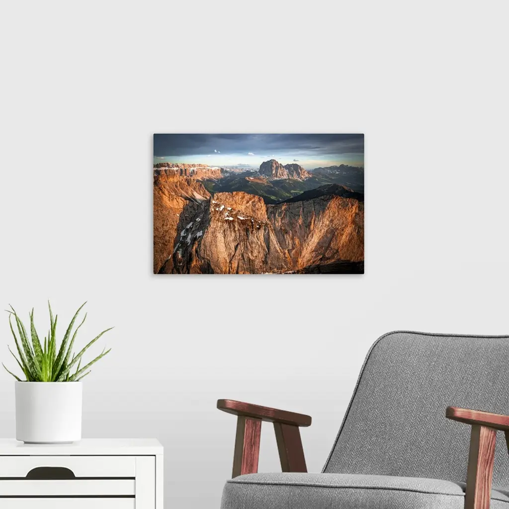 Aerial view of Sassolungo group, Sassopiatto, Sella, Gardena Valley and Seceda at sunset, Dolomites, South Tyrol, Italy.