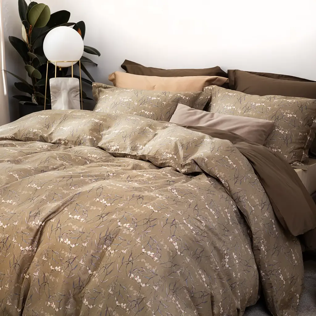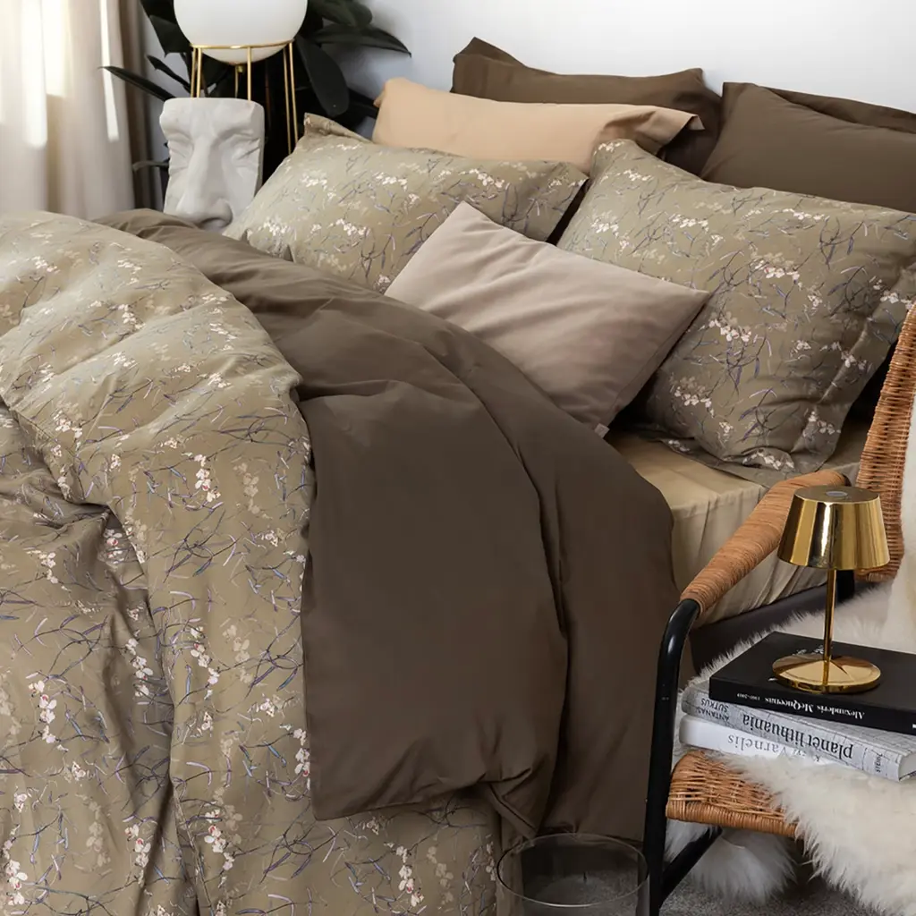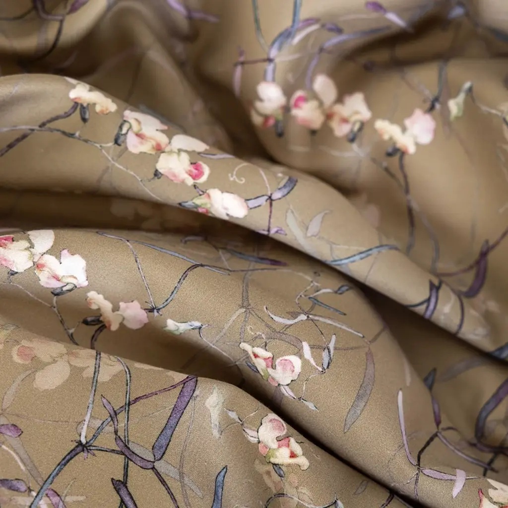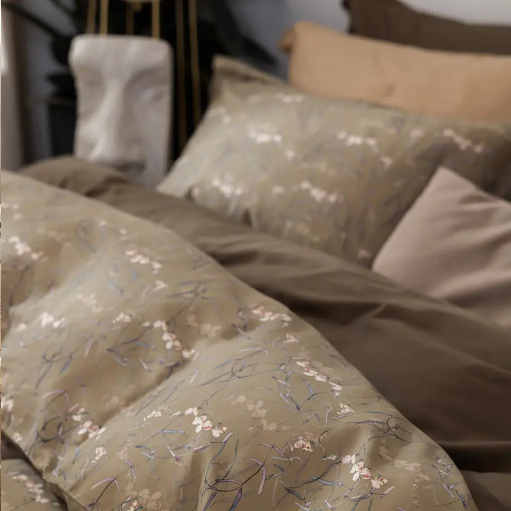 Dreamy Khaki sateen bed linen set is a subtle natural colour with fine floral motifs, giving a luxurious feel and gently blending into the bedroom interior.The long-fiber cotton sateen with a TC300 weaving density is designed for durability. Cotton sateen is a natural material with a natural shine, soft to the touch, and very easy to care for.
