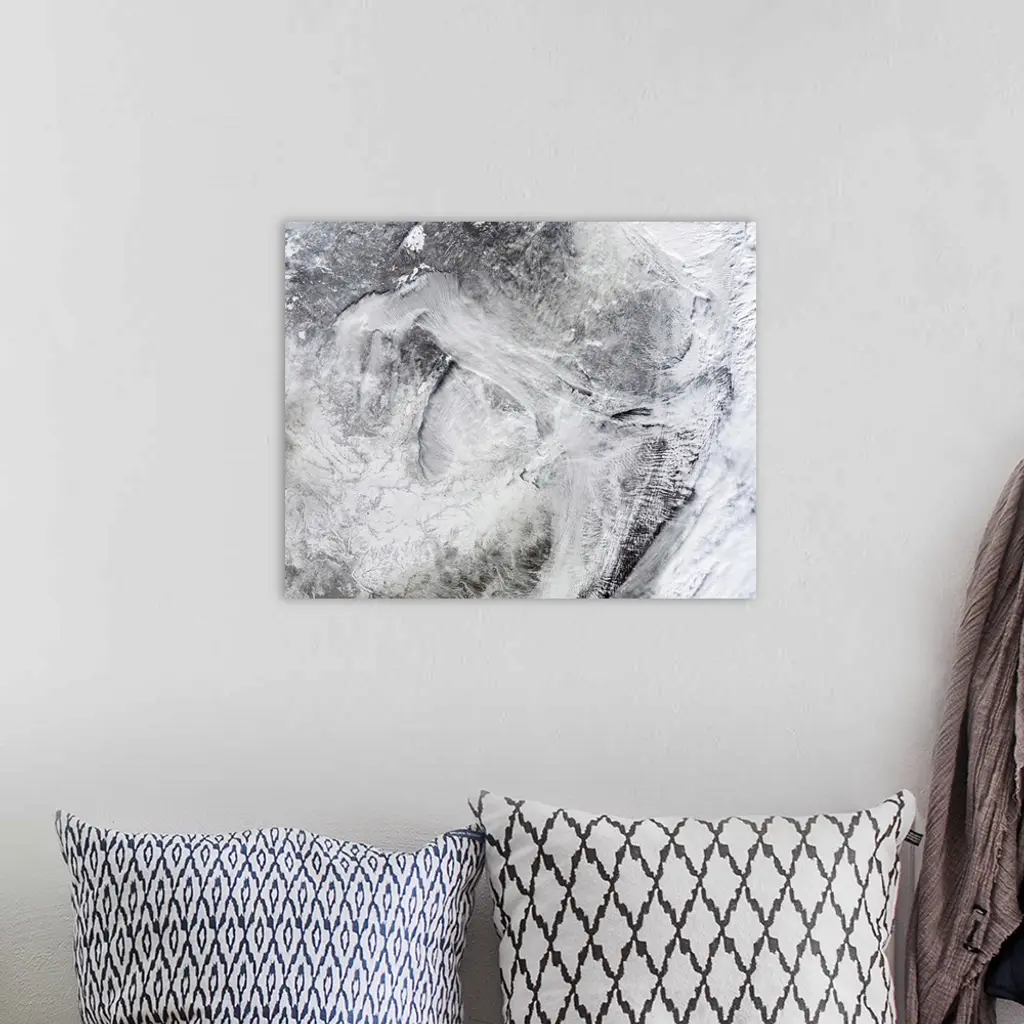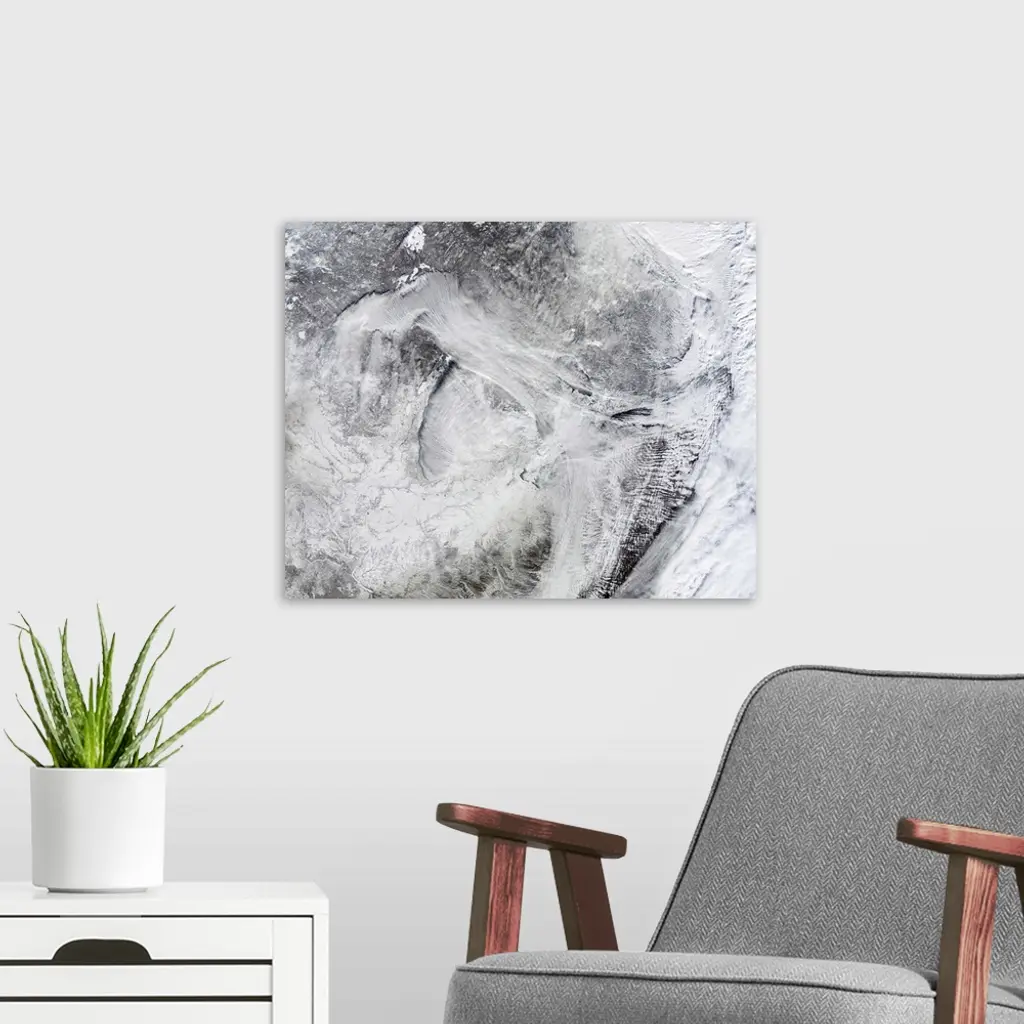 January 6, 2014 - Satellite view of fog forming over the Great Lakes and streaming southeast with the wind. A swirling mass of Arctic air moved south into the continental United States in early January. The air mass began breaking off from the polar vortex, a semi-permanent low-pressure system with a center around Canada...s Baffin Island. The frigid air was pushed south into the Great Lakes region by the jet stream, bringing abnormally cold temperatures to many parts of Canada and the central and eastern United States...When the cold air passed over the relatively warm waters of Lake Michigan and Lake Superior, the contrast in temperatures created a visual spectacle. As cold, dry air moved over the lakes, it mixed with warmer, moister air rising off the lake surfaces, transforming the water vapor into fog, a phenomenon known as steam fog.