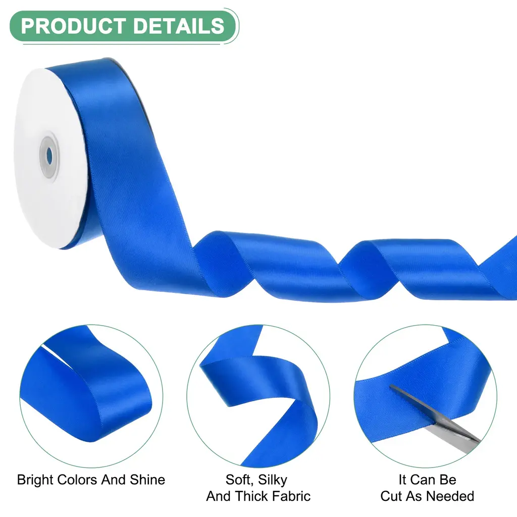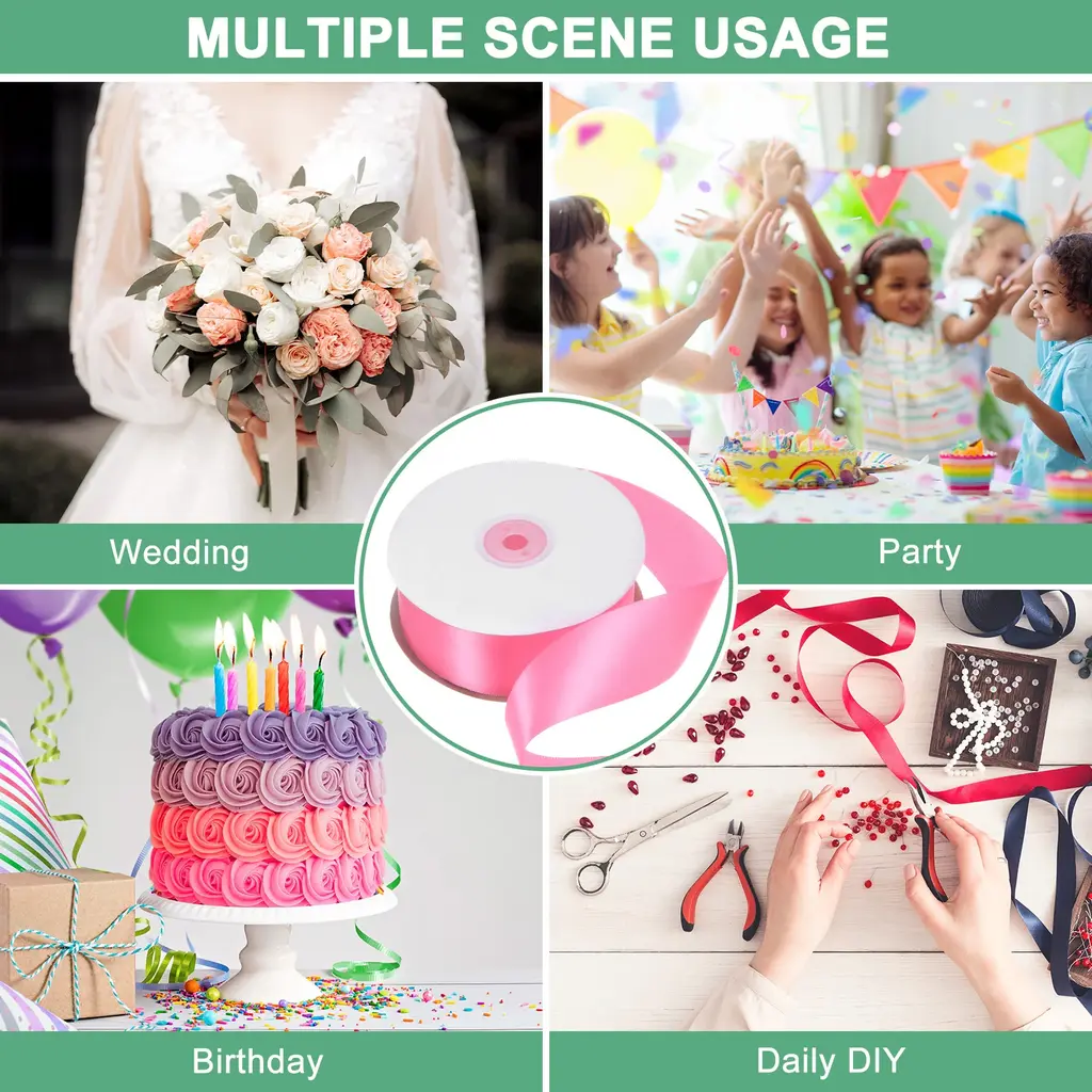 PRODUCT APPLICATIONSWhether pink satin ribbon is a romantic decoration at a wedding, a warm package for holiday gifts, or daily DIY about sewing, hanging ornaments, gift making, card making and home decoration.PRODUCT DETAILS & INCLUDE√ Material: Polyester√ Color: Pink/Army Green/Light Green/Blue/Dark Blue/Light Blue/Gray√ Overall Size: 3.8 cm/1.5 inches X 50 Yards/Spool√ Package Includes: 1Pcs X Ribbon For Gift Wrapping PRODUCT ADVANTAGES1.The bow ribbon is made of silky polyester, it has a smooth and lustrous surface and is not prone to wrinkling, shrinking or fading. It is easy to use for making delicate bows or crafts.2.There are a variety of colors to choose from, providing you with unlimited creative possibilities. Bright and lively, pure and beautiful color. The ribbon for flower bouquet can add an indispensable atmosphere to festive decorations and gift packaging.3.The silk ribbon 1-1/2 inch can be cut at will, enough to meet all your needs from small crafts to large decorative projects.ATTENTIONConfirm the size and color of wrapping ribbon before ordering.