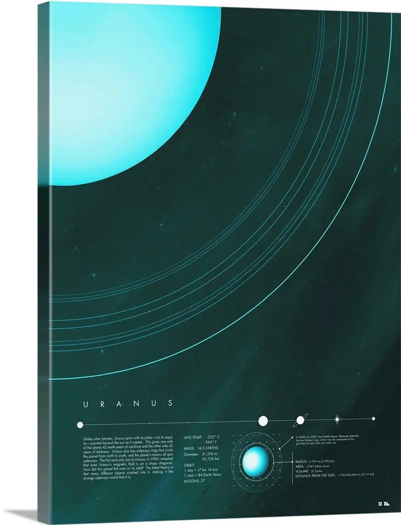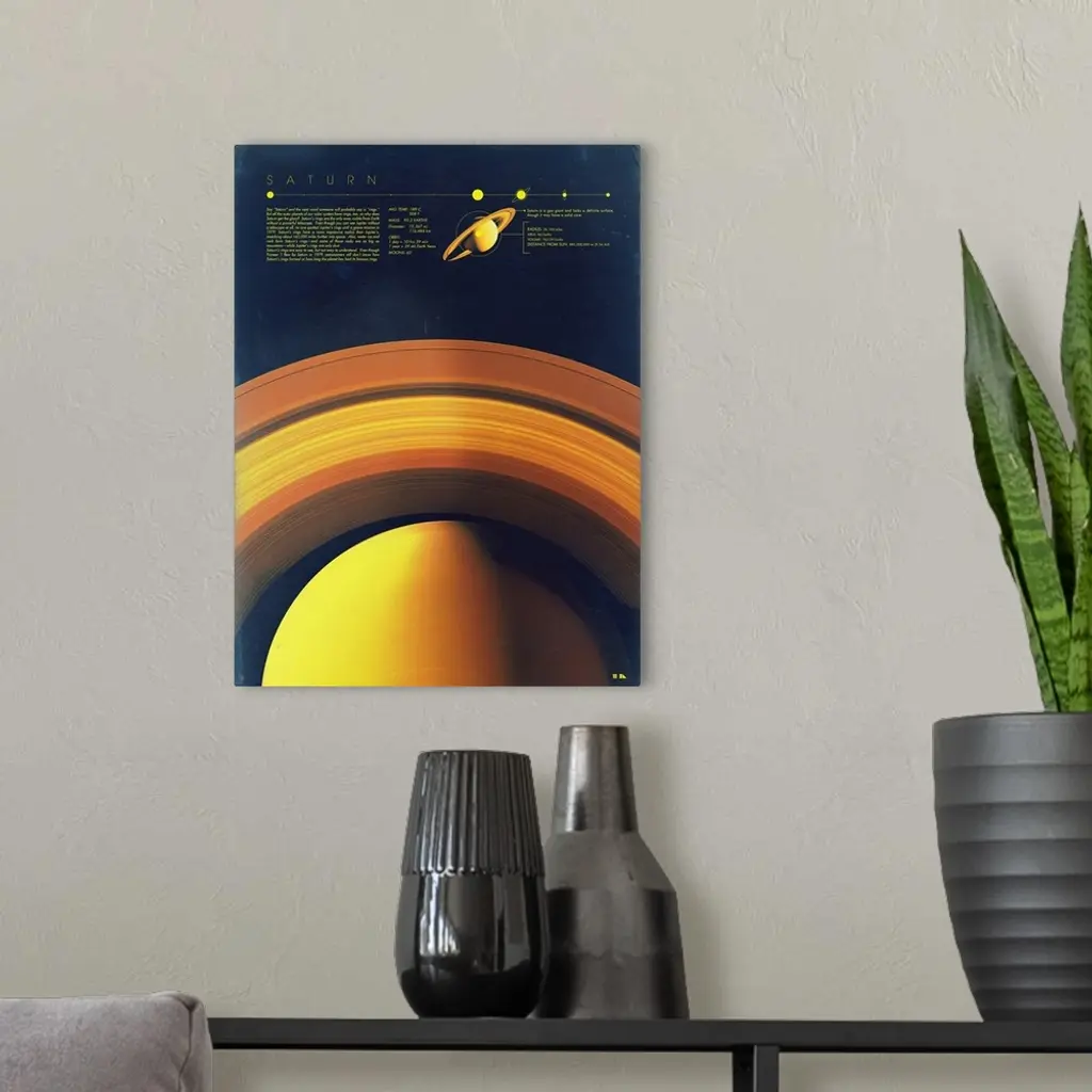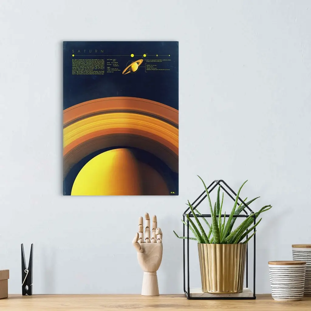 Educational graphic poster of Saturn with written facts at the bottom including average temperature, mass, diameter, orbit, and a diagram. Write up reads: "Say "Saturn" and the next word someone will probably say is "rings." But all the outer planets of our solar system have rings, too, so why does Saturn get the glory? Saturn's rings are the only ones visible from Earth without a powerful telescope. Even though you can see Jupiter without a telescope at all, no one spotted Jupiter's rings until a space mission in 1979. Saturn's rings have a more impressive radius than Jupiter's, stretching about 165,000 miles further into space. Also, water ice and rock form Saturn's rings, and some of those rocks are as big as mountains, while Jupiter's rings are only dust. Saturn's rings are easy to see, but not easy to understand. Even though Pioneer 1 flew by Saturn in 1979, astronomers still don't know how Saturn's rings formed or how long the planet has had its famous rings."